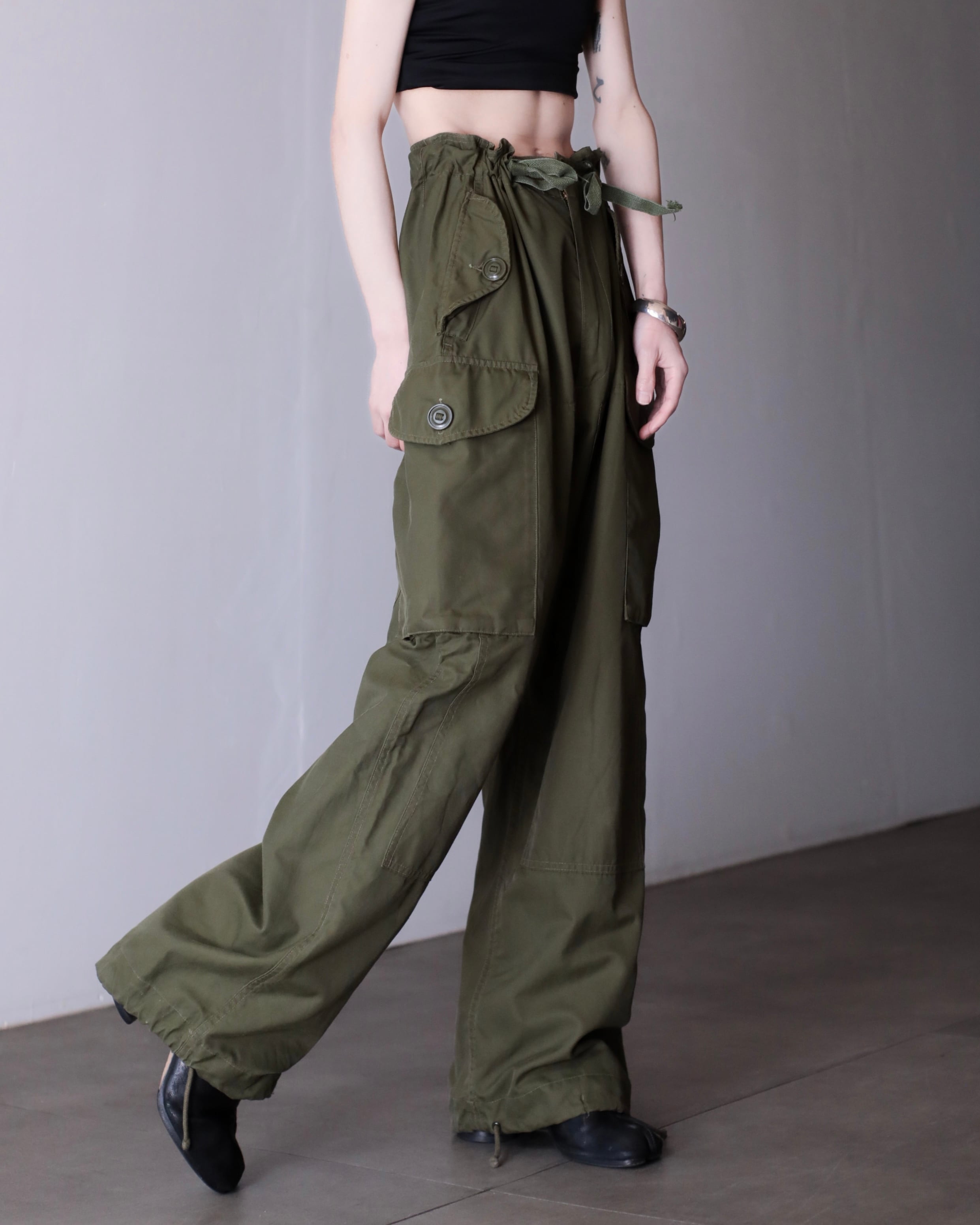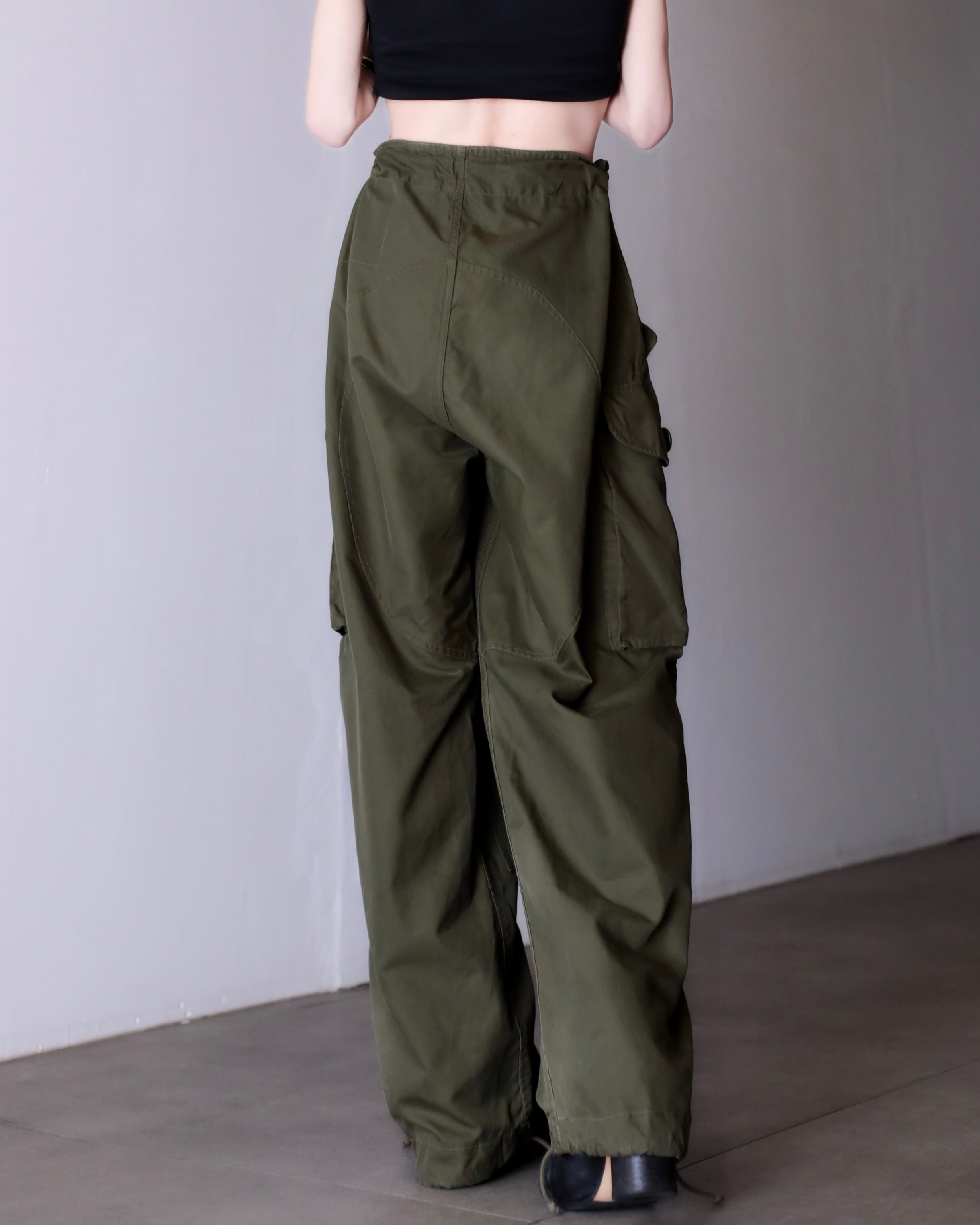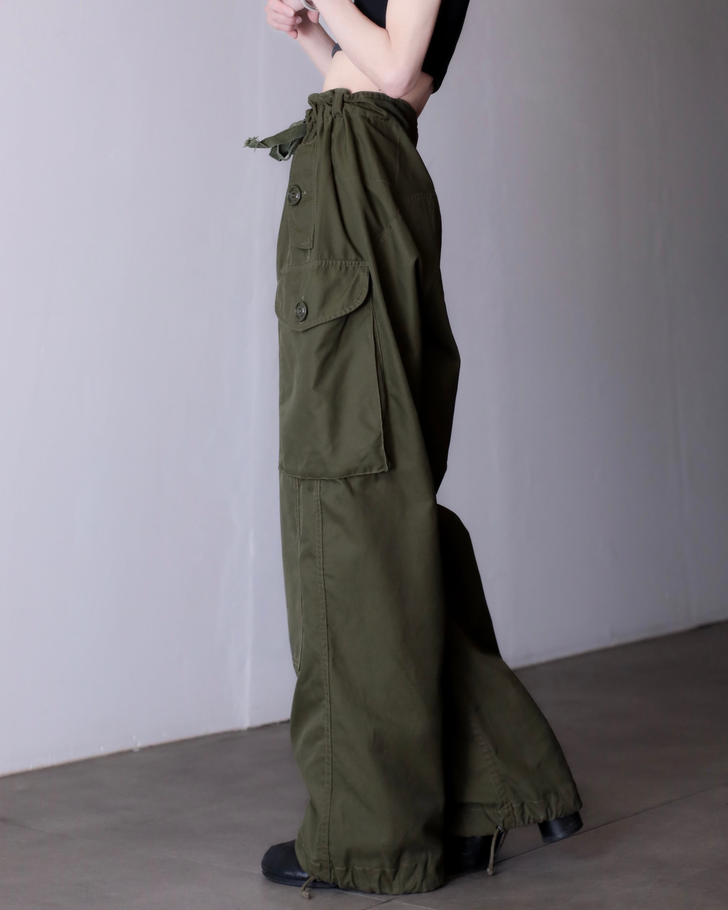 ウエスト 〜100cm (紐で最小まで絞れます) / 股下 74cm / 総丈 109cm / 裾幅 〜27cm (紐で絞れます)