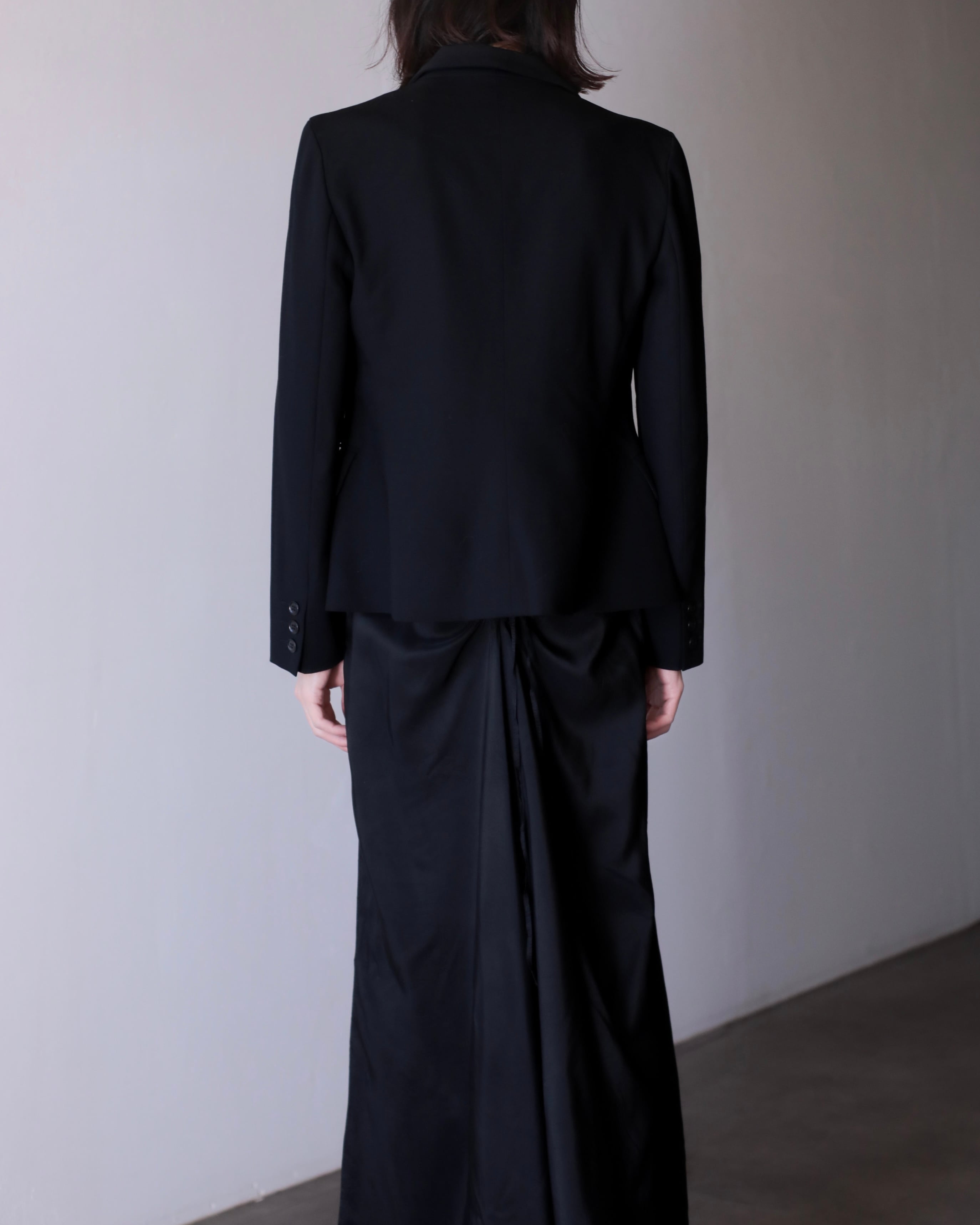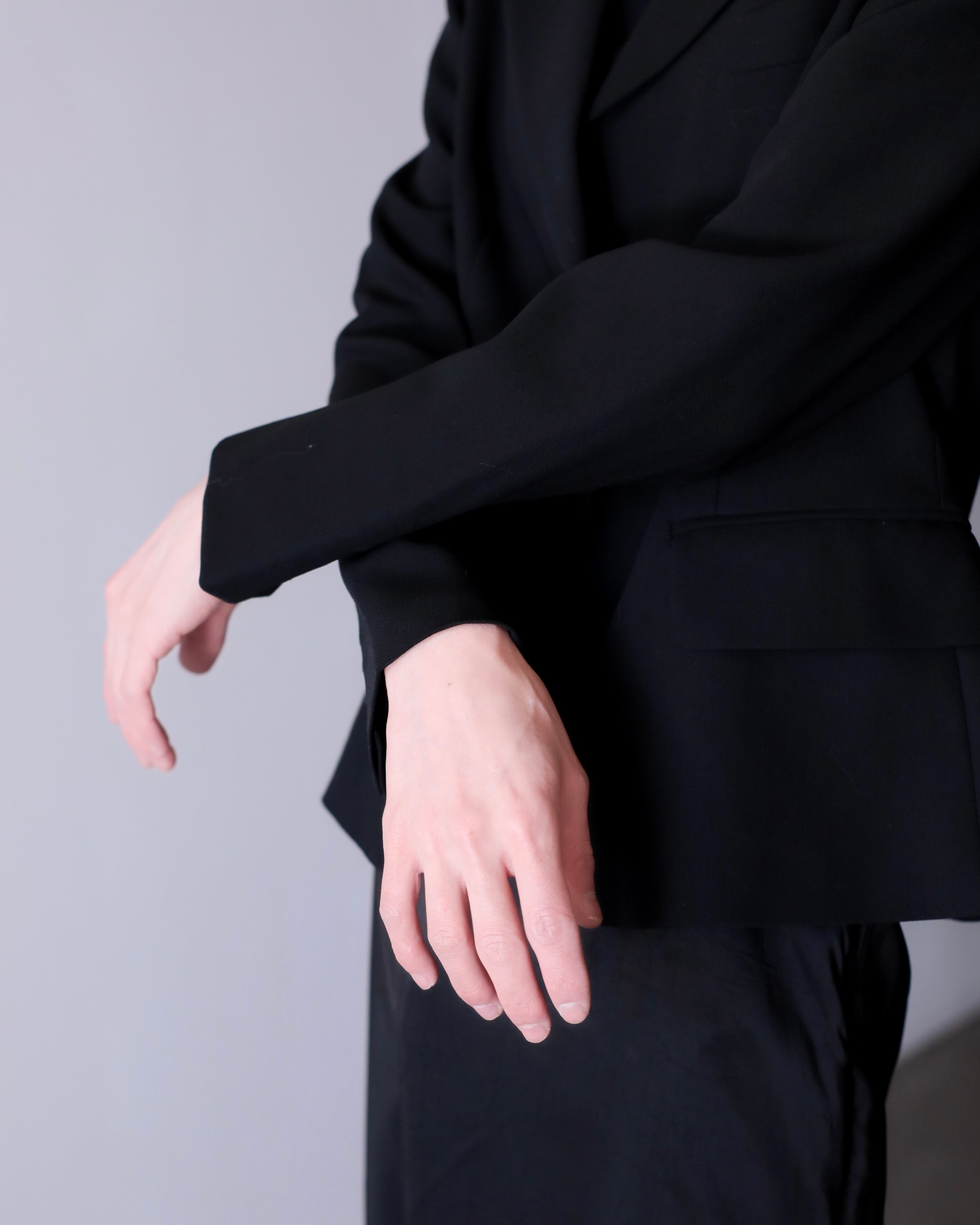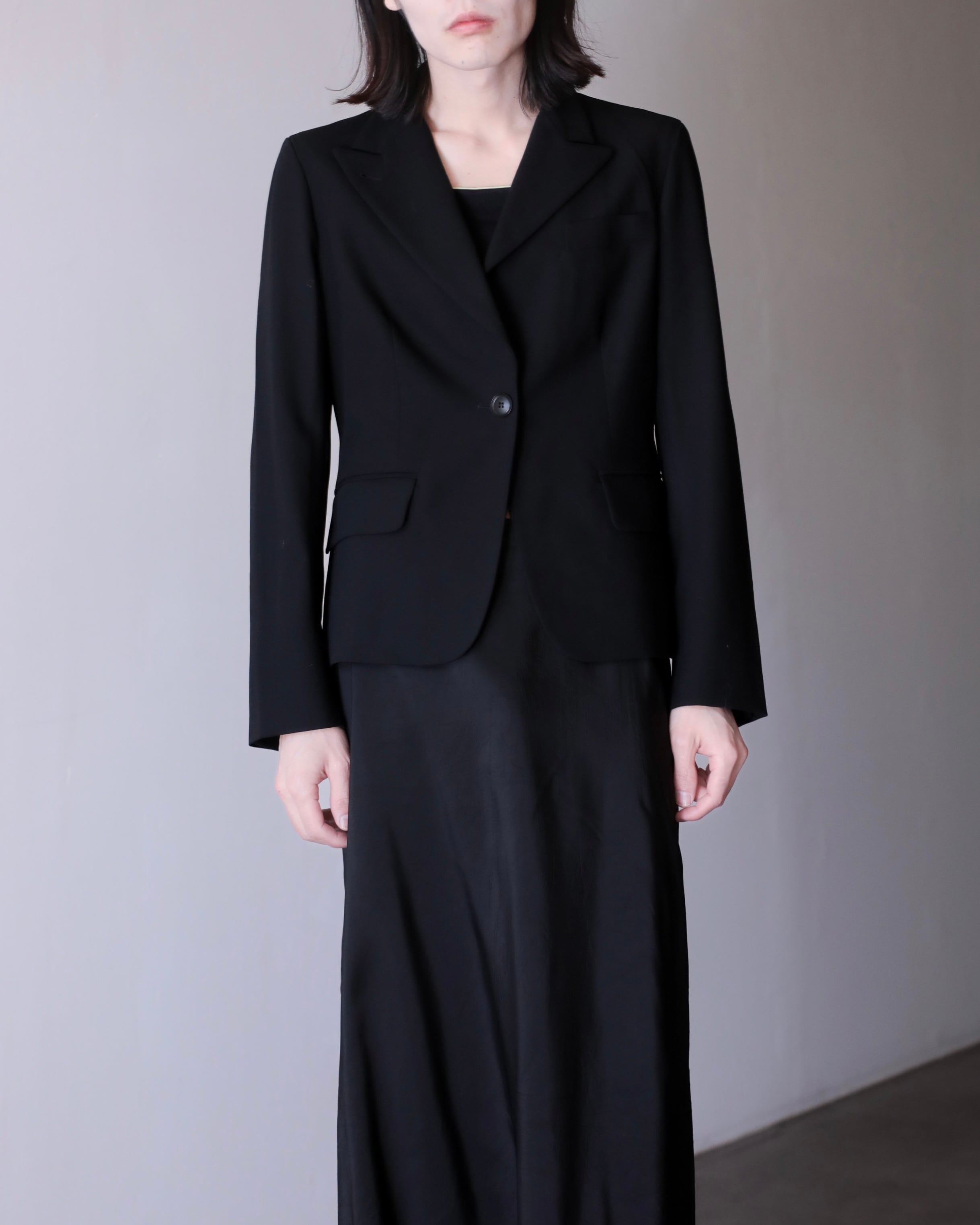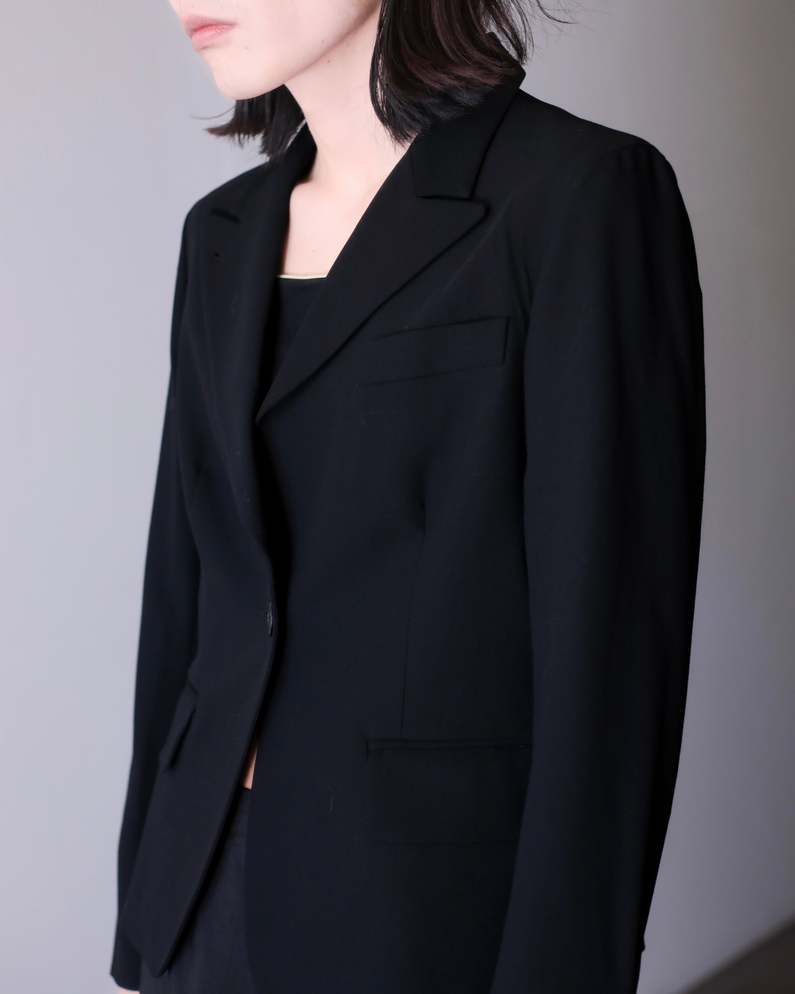 ピークドラペルによって顔まわりがすっきり見えてくれるので着るだけで小顔に見えます。