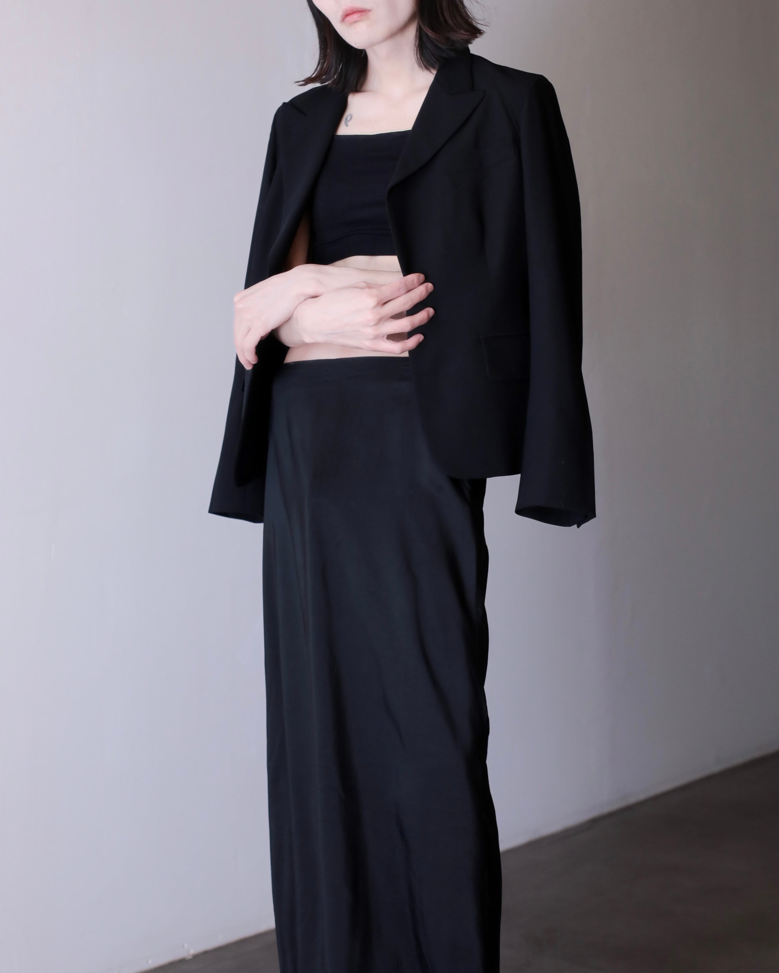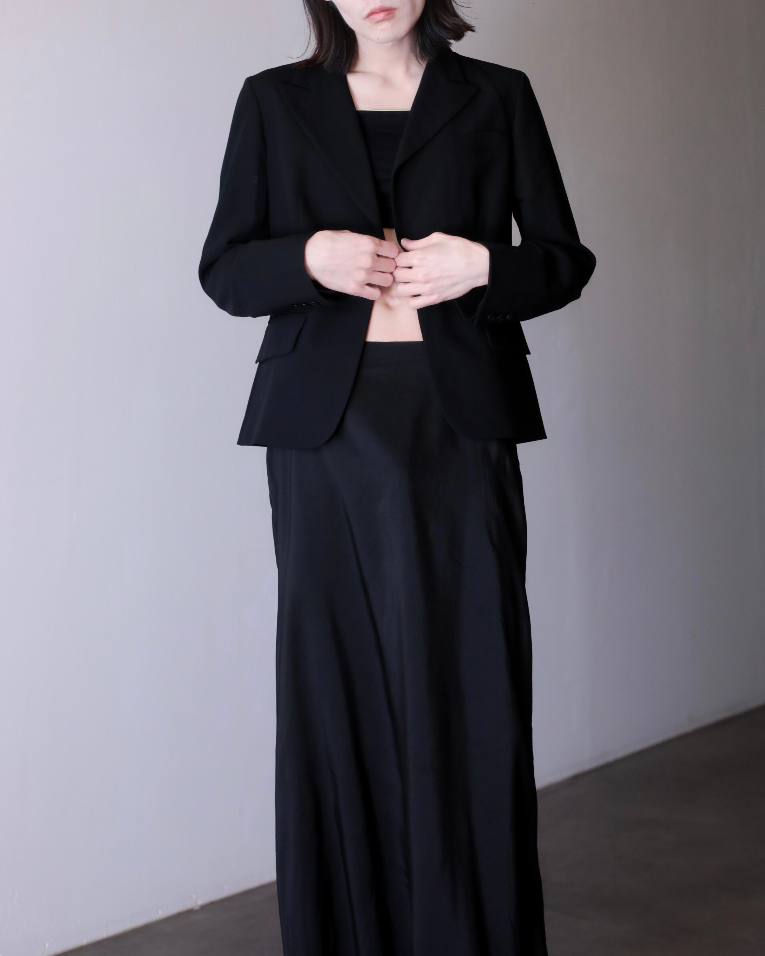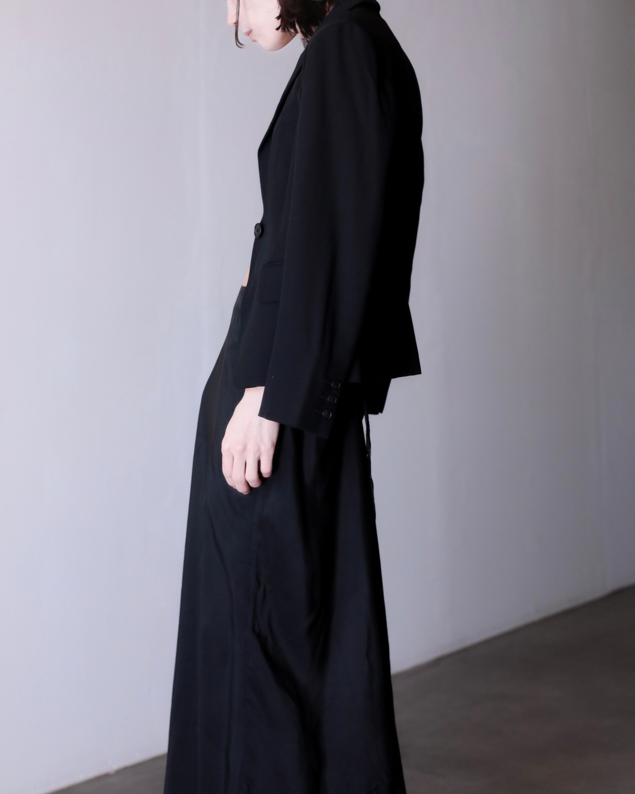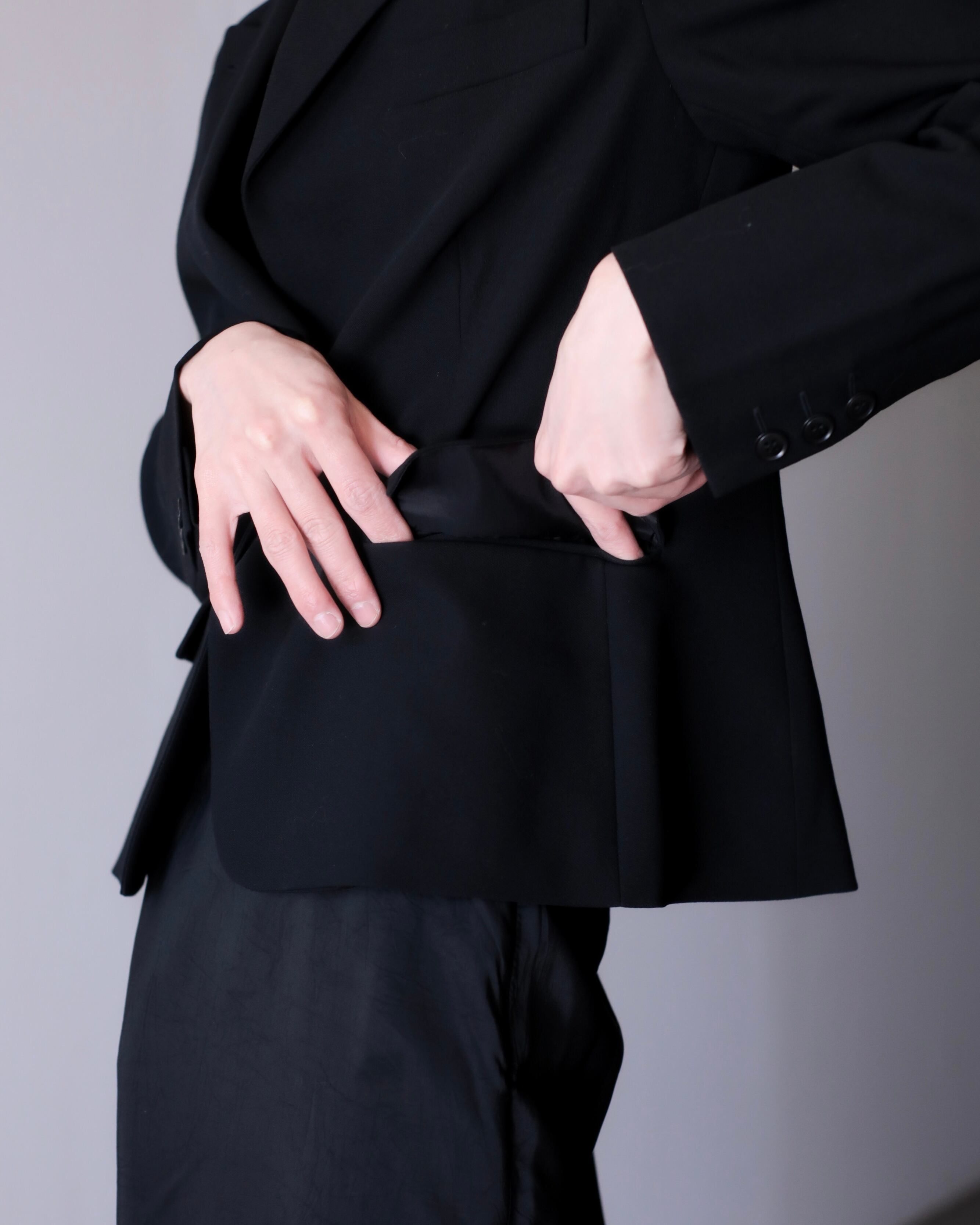 ピークドラペルによって顔まわりがすっきり見えてくれるので着るだけで小顔に見えます。