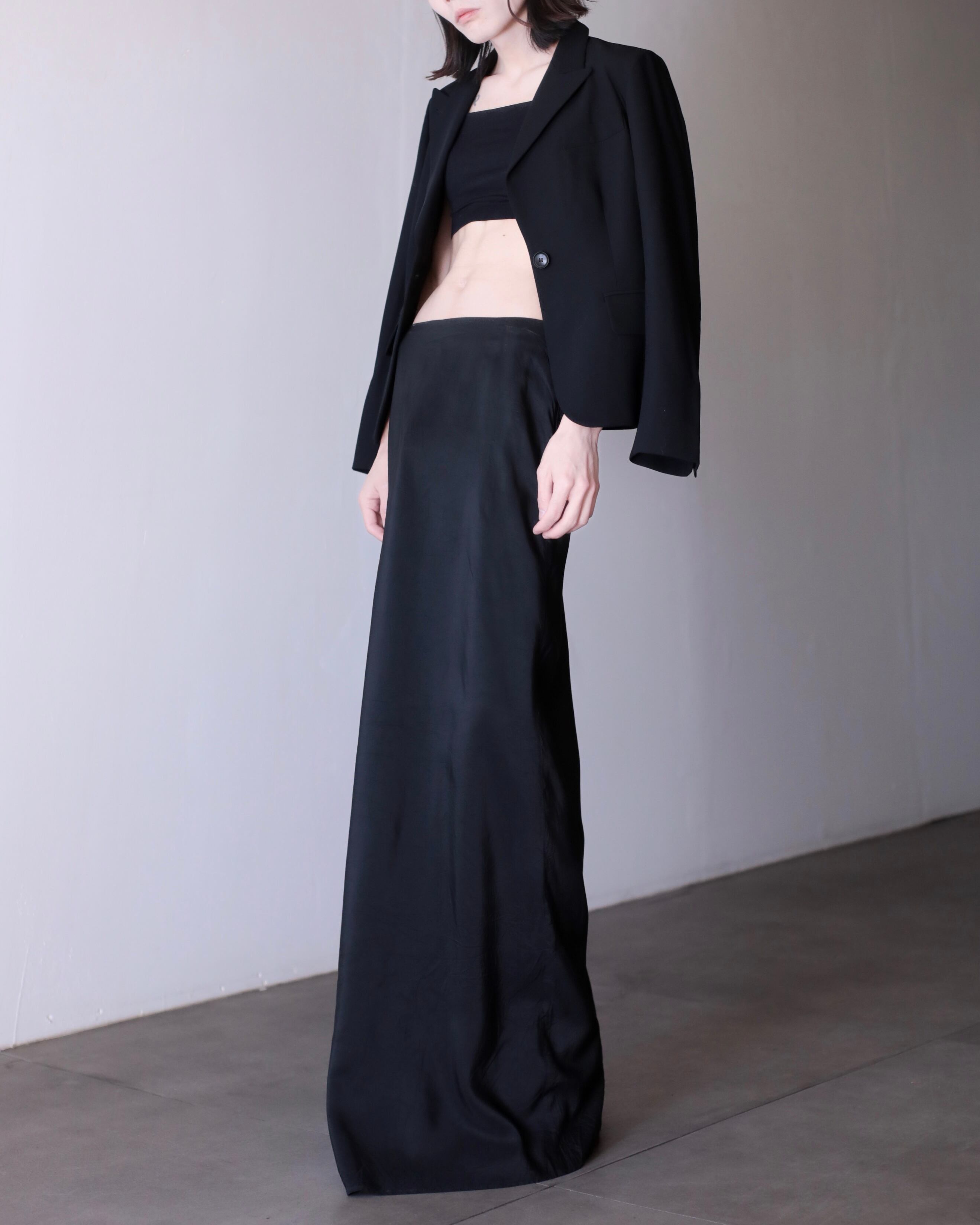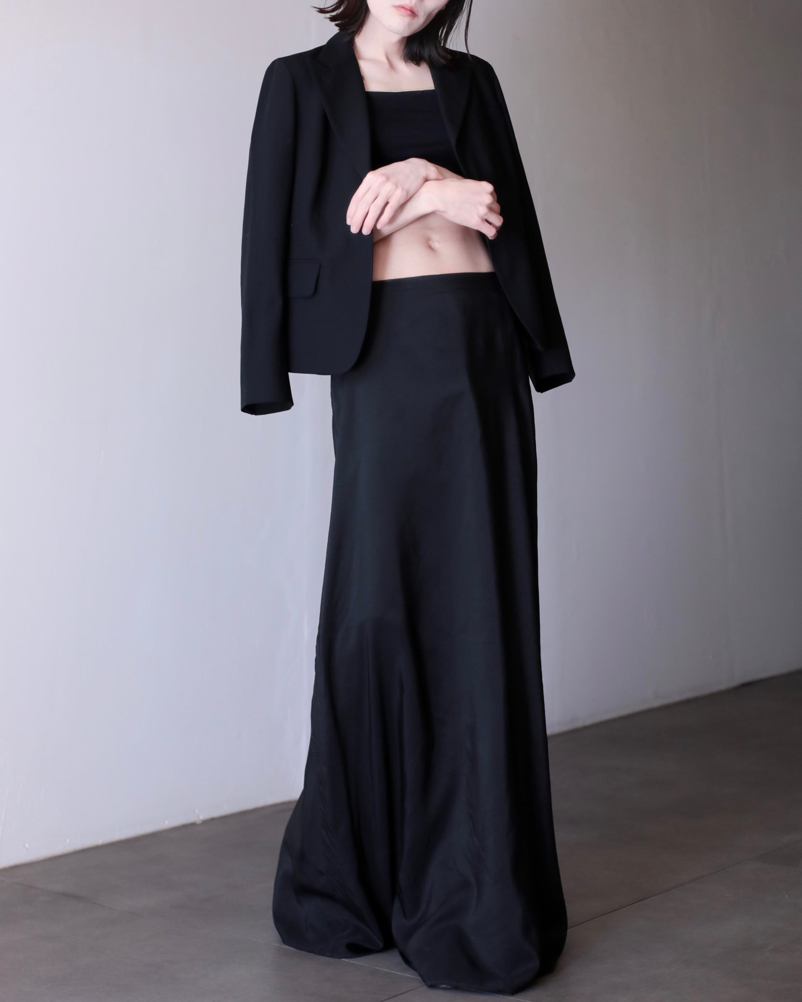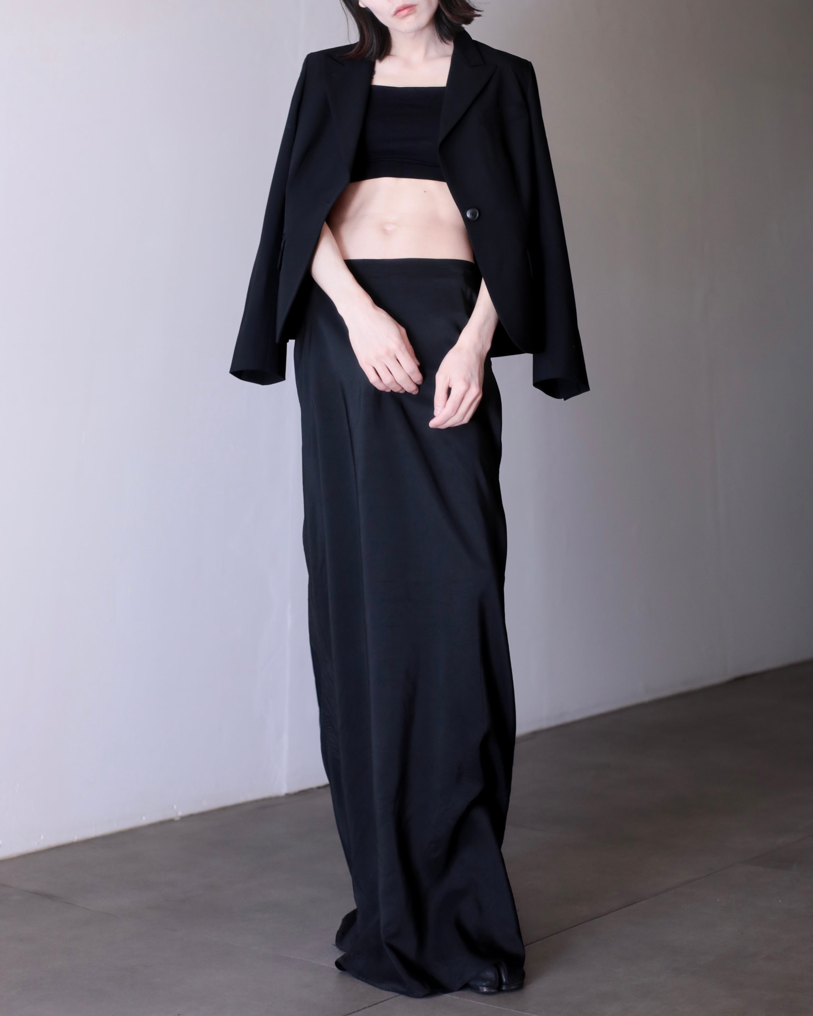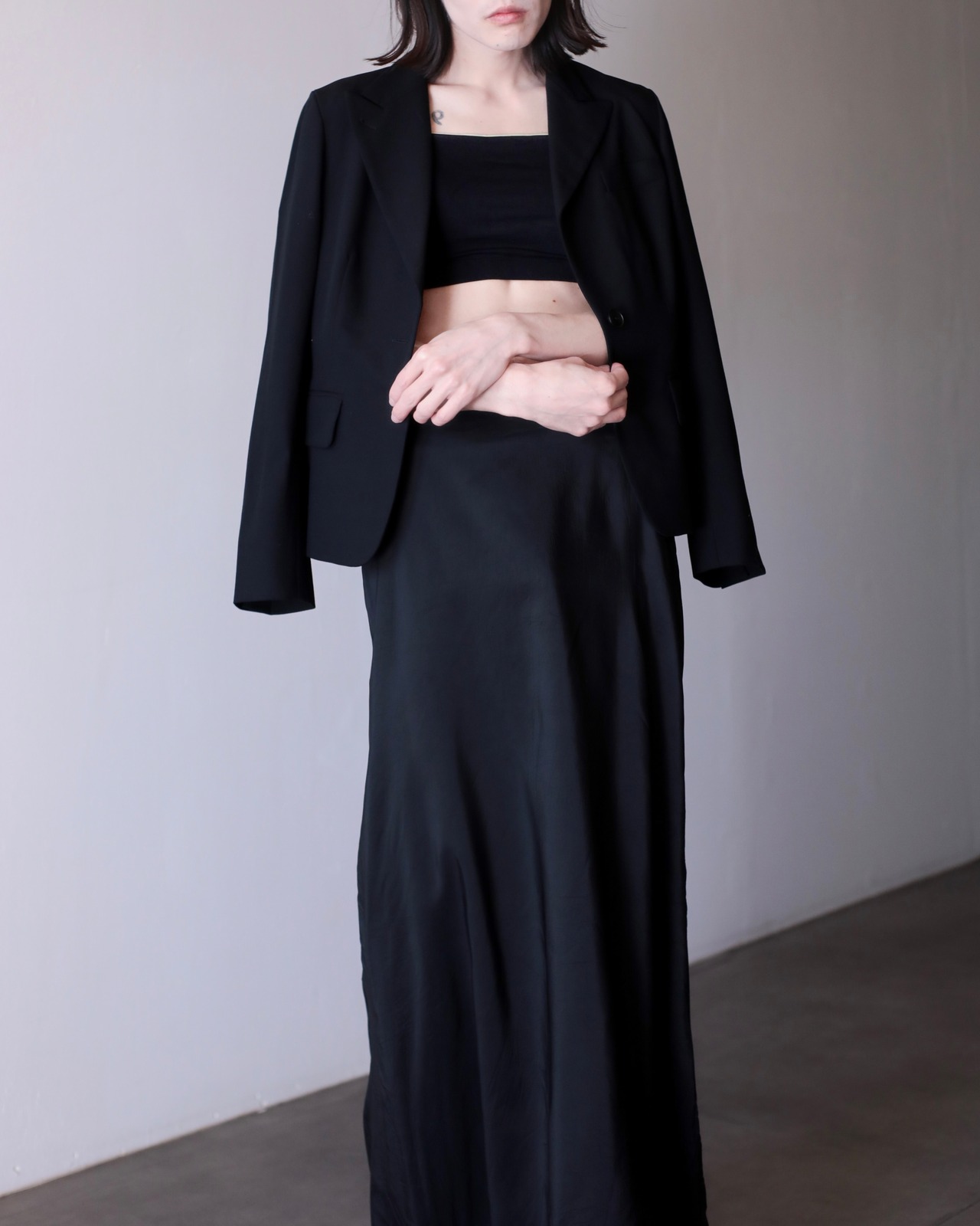 ピークドラペルによって顔まわりがすっきり見えてくれるので着るだけで小顔に見えます。