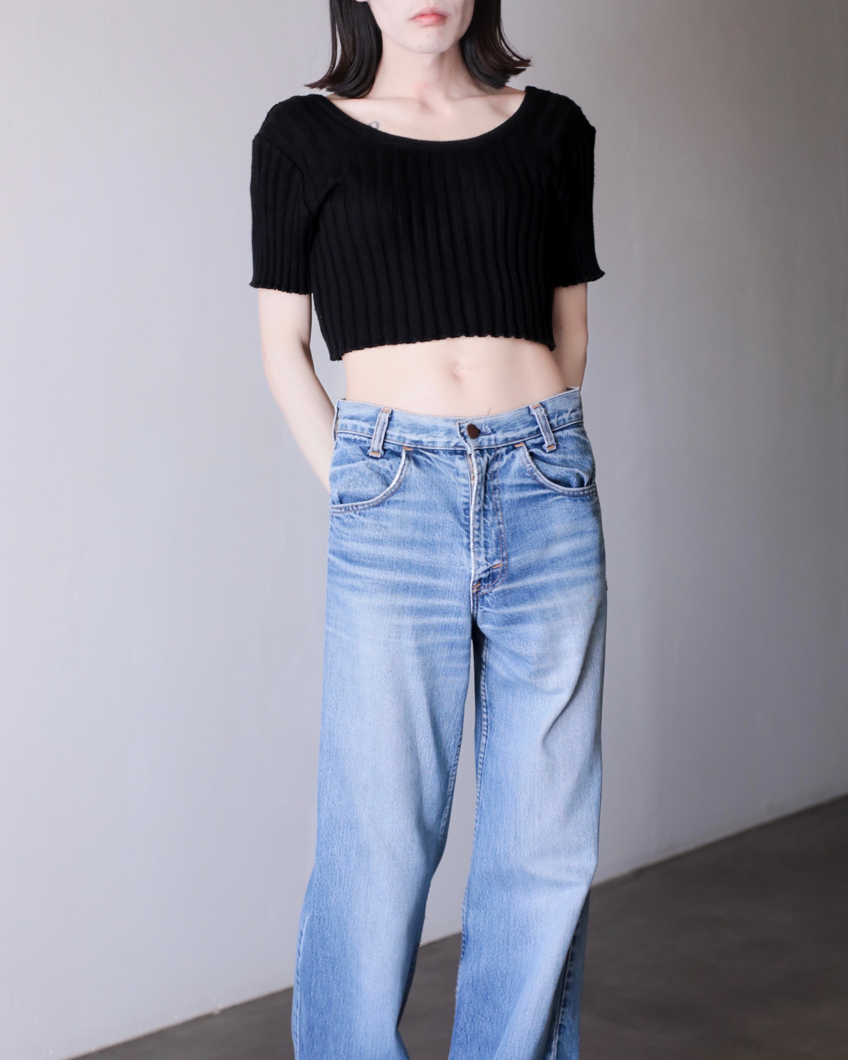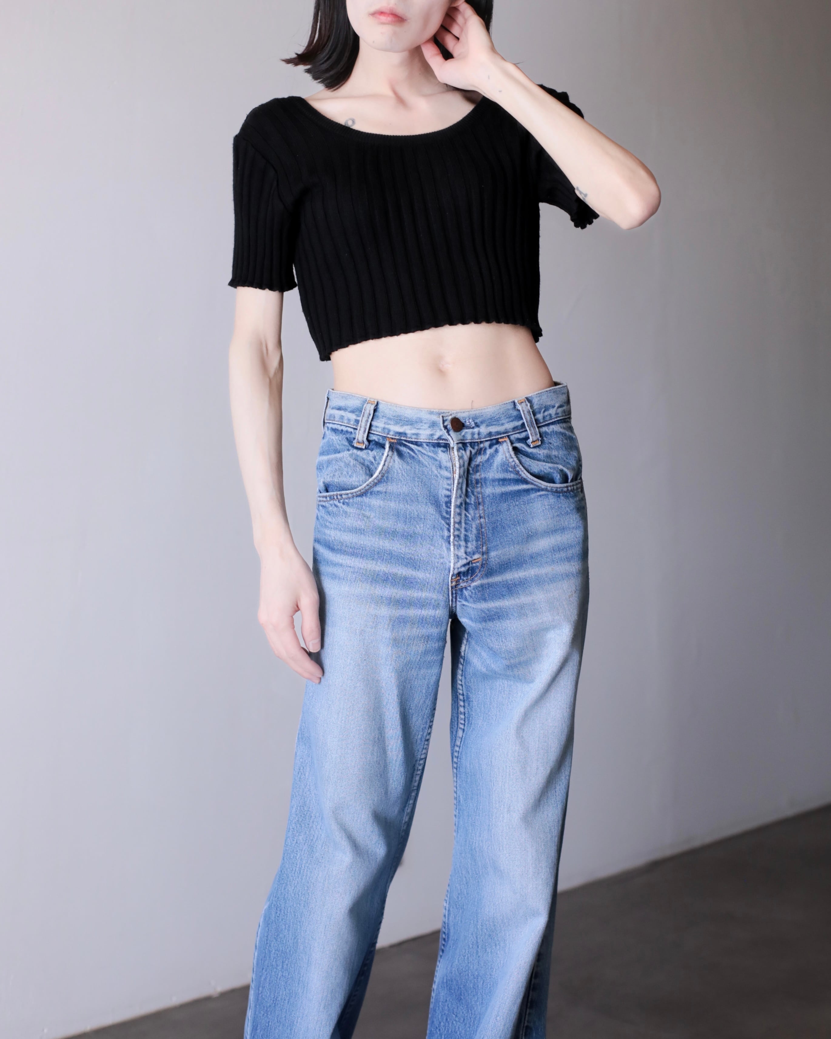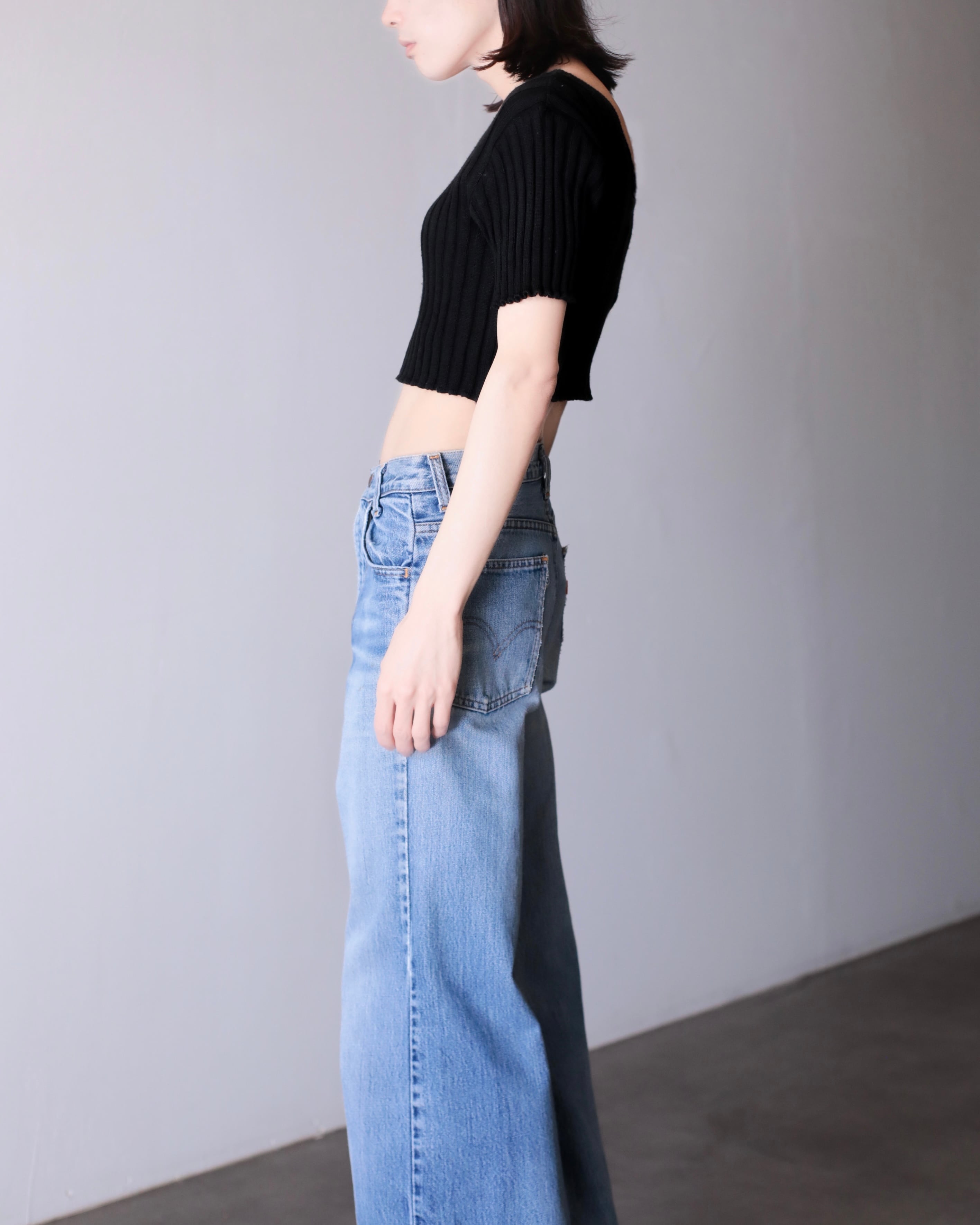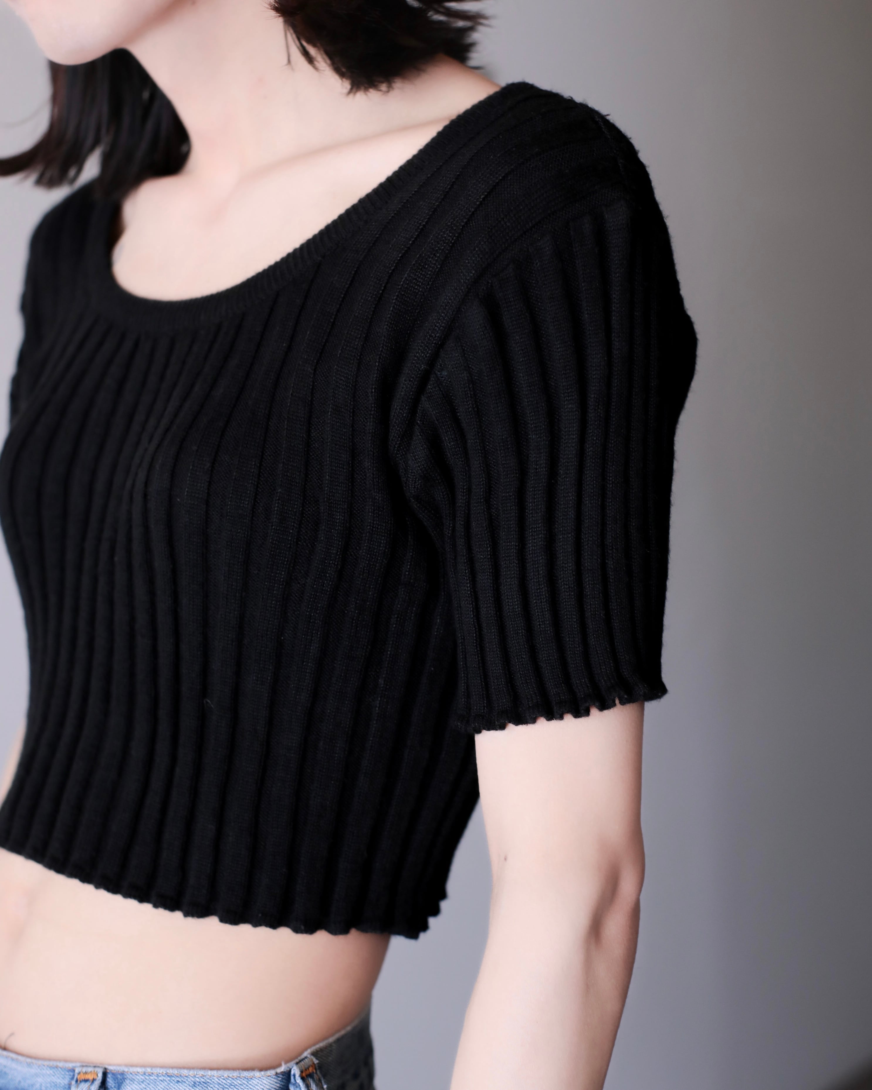 short sleeve U-neck design rib knit top