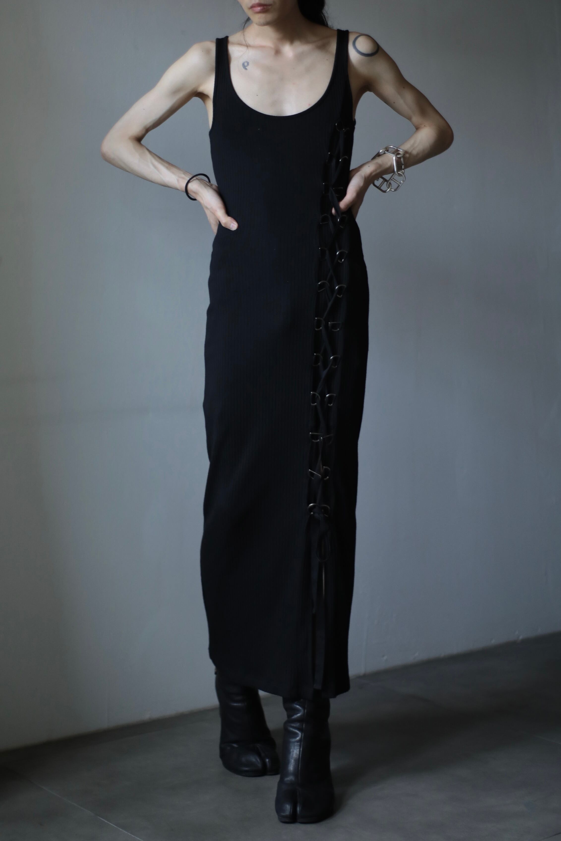 フロント左サイドがレースアップデザインになっていてブラック単色ながらエッジの効いたモードな印象のワンピースです。