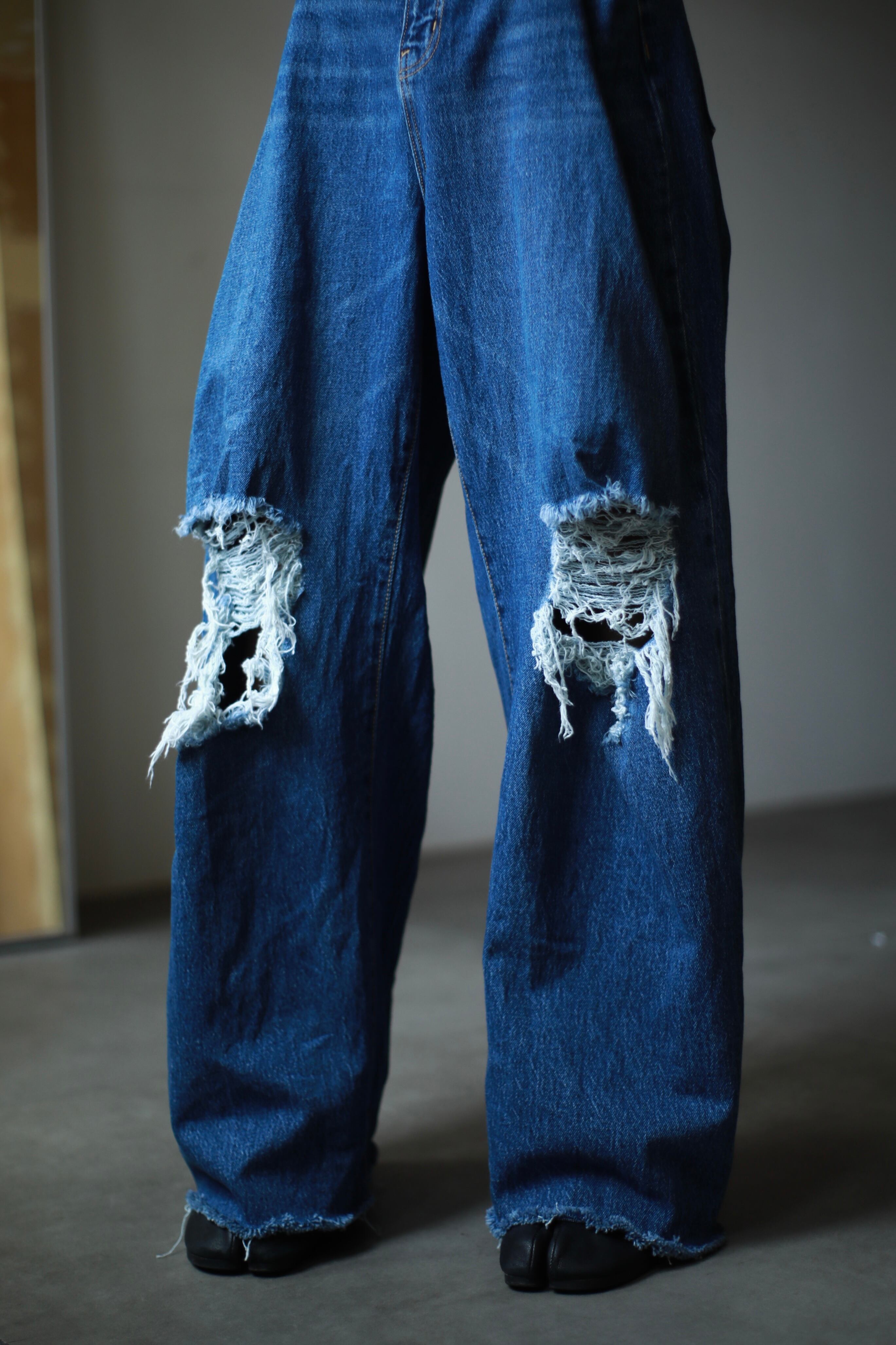 destroy design hi-waist wide baggy silhouette volume denim pants
