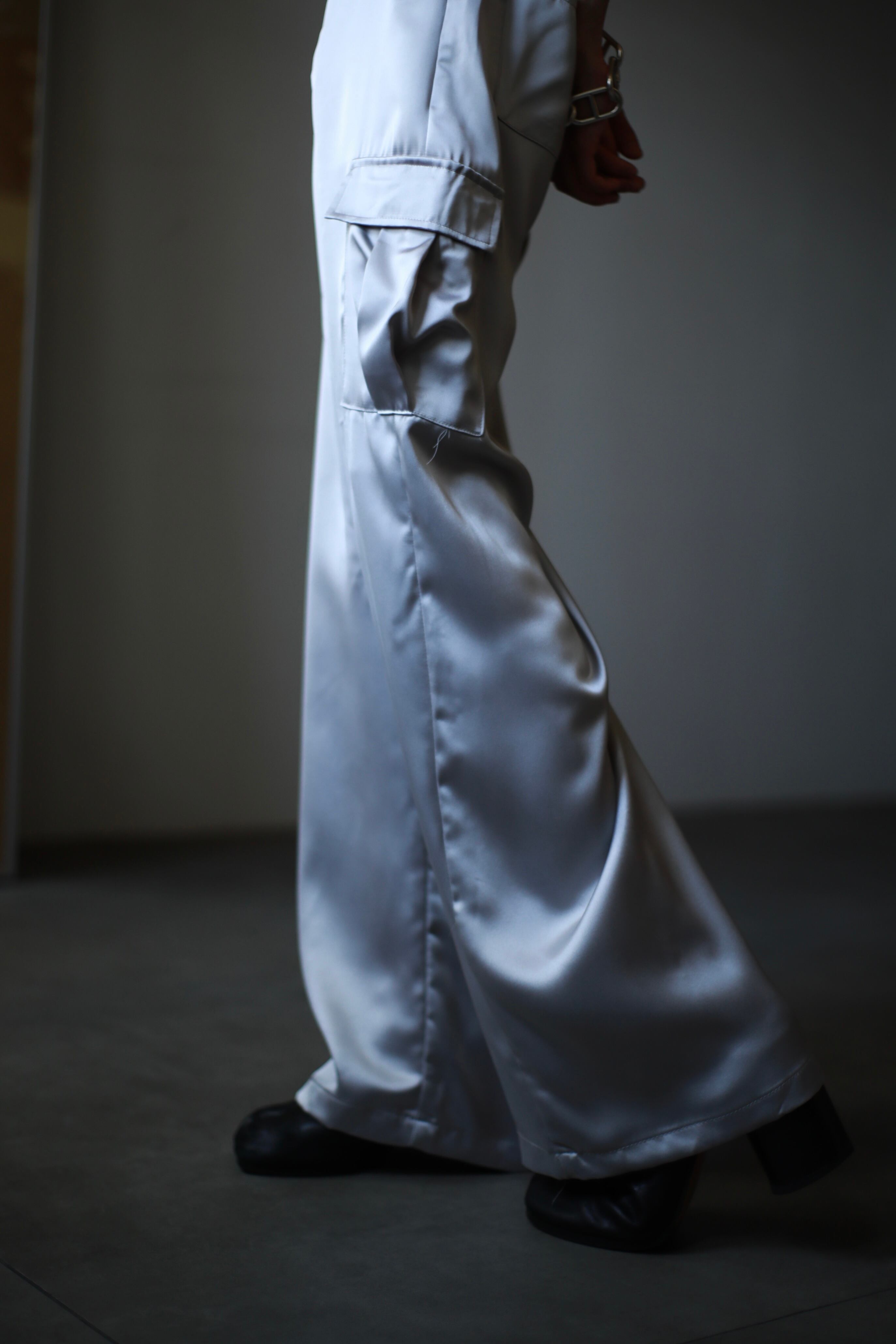 スラックスをベースにカーゴディテールを混ぜ込み、サテン生地でより綺麗目に仕上げたモードな一本。