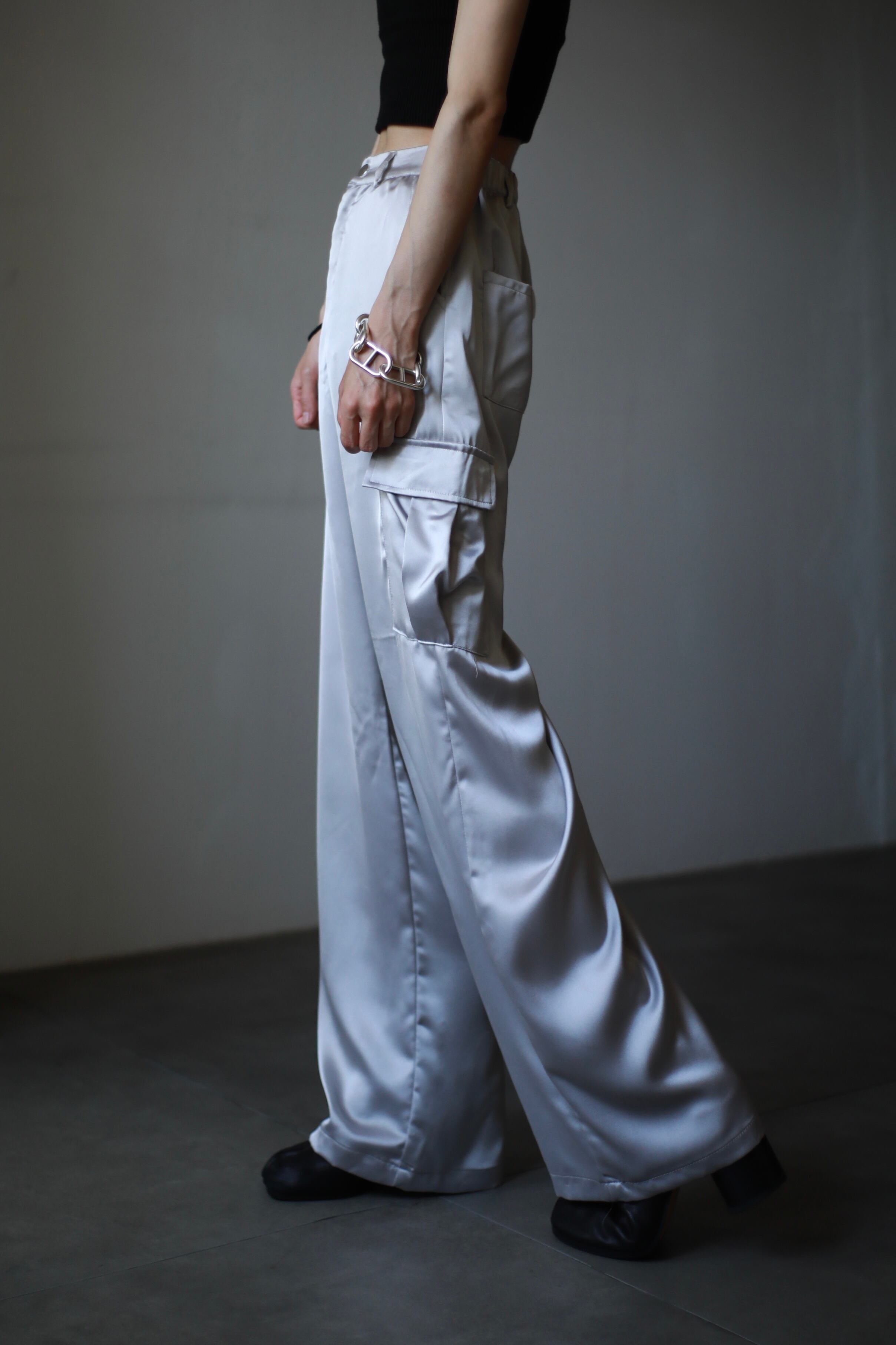 silver satin wide straight hi-waist cargo design pants