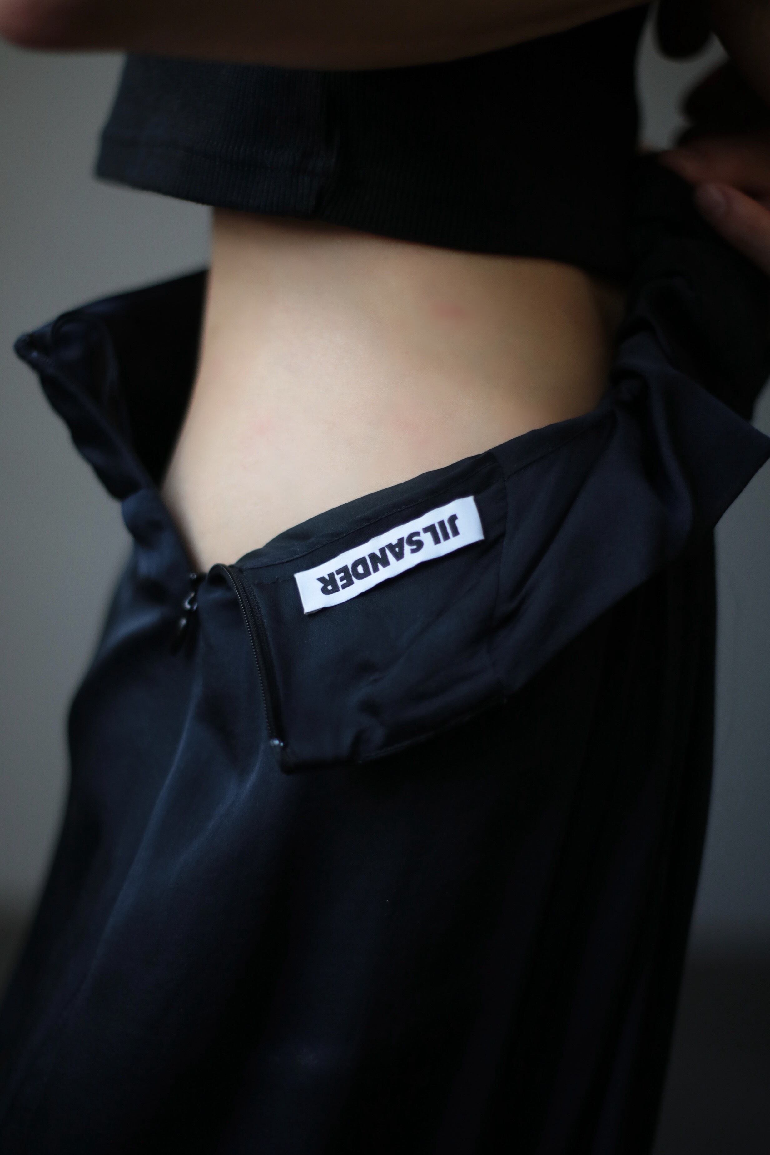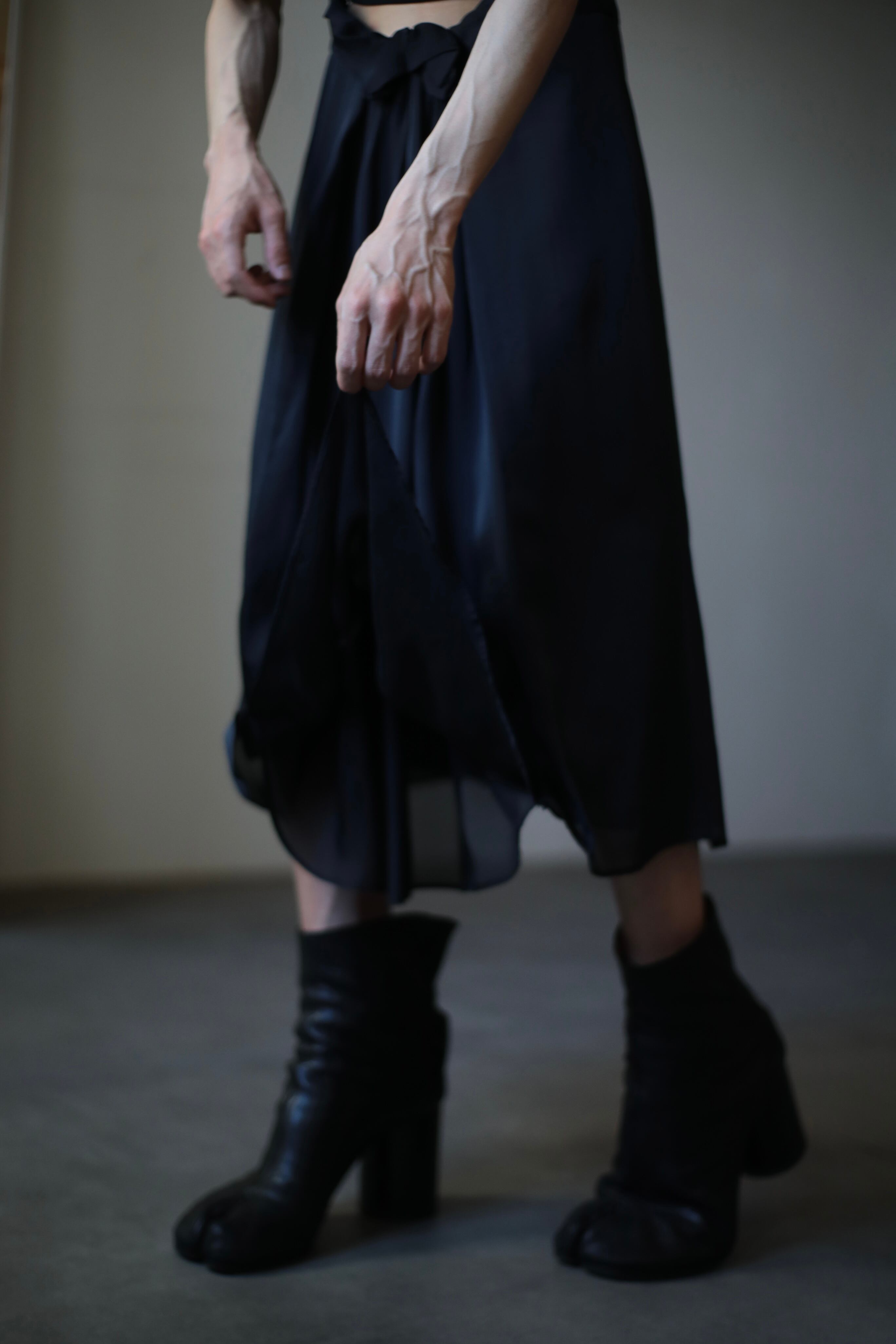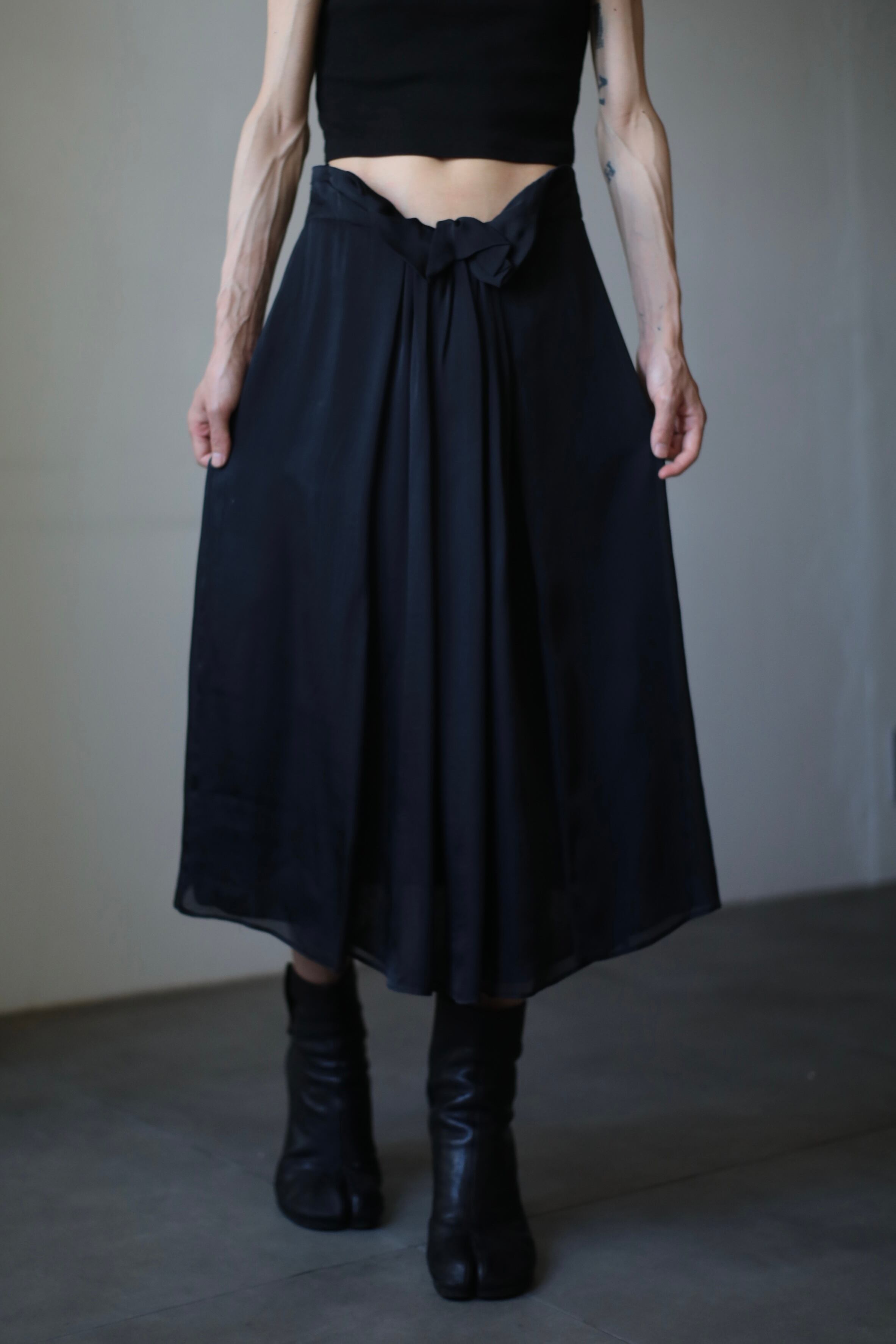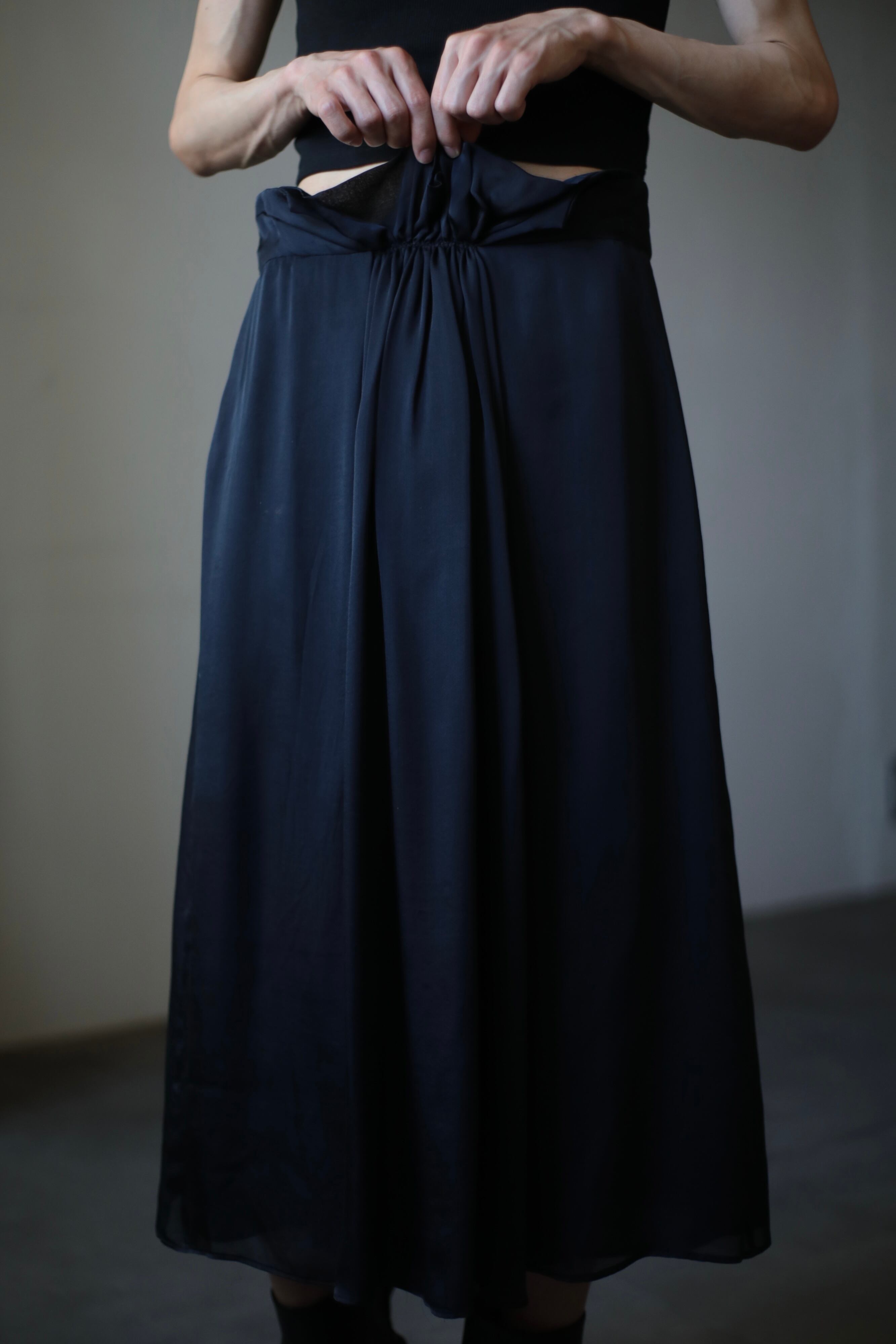 ウエスト中央がくぼんでいて、その下にタックプリーツがびっしりとあしらわれる他にはない唯一無二のデザイン。
