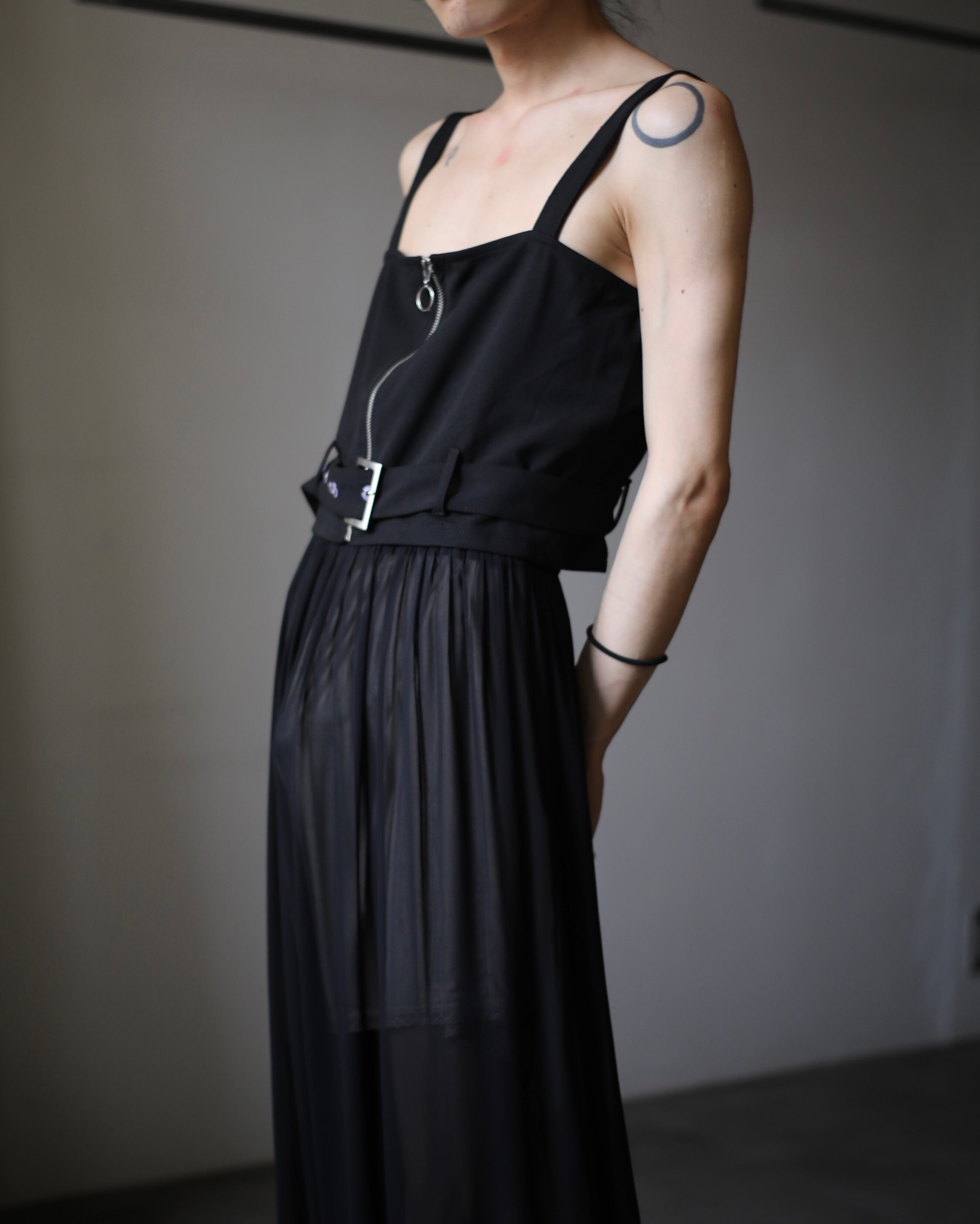 ジャケットの中に仕込んでジップやベルト感楽しんだり、もしくはジャケットの上に着てデザイン性のあるスタイリングにするのも可愛いと思います!
