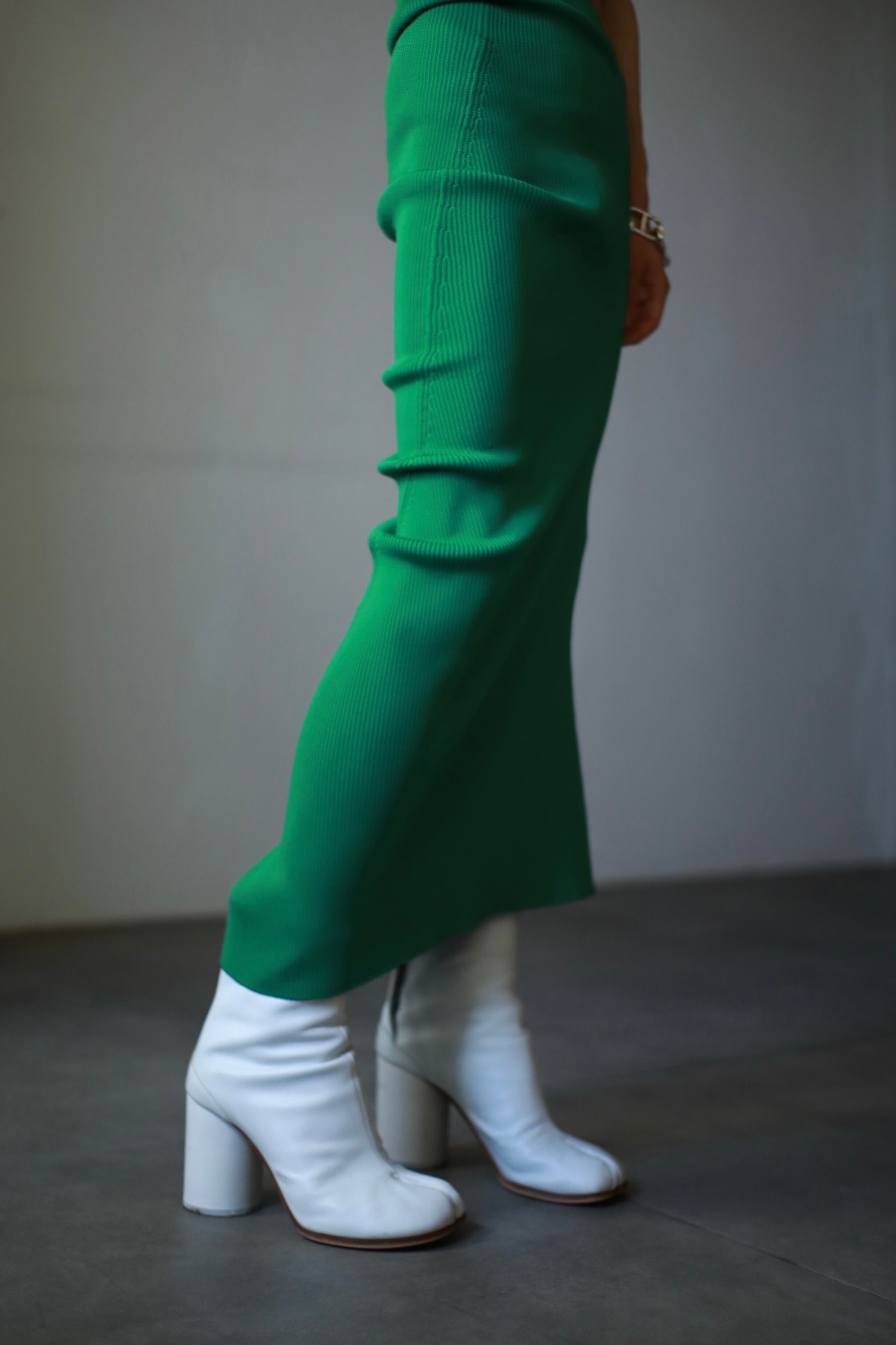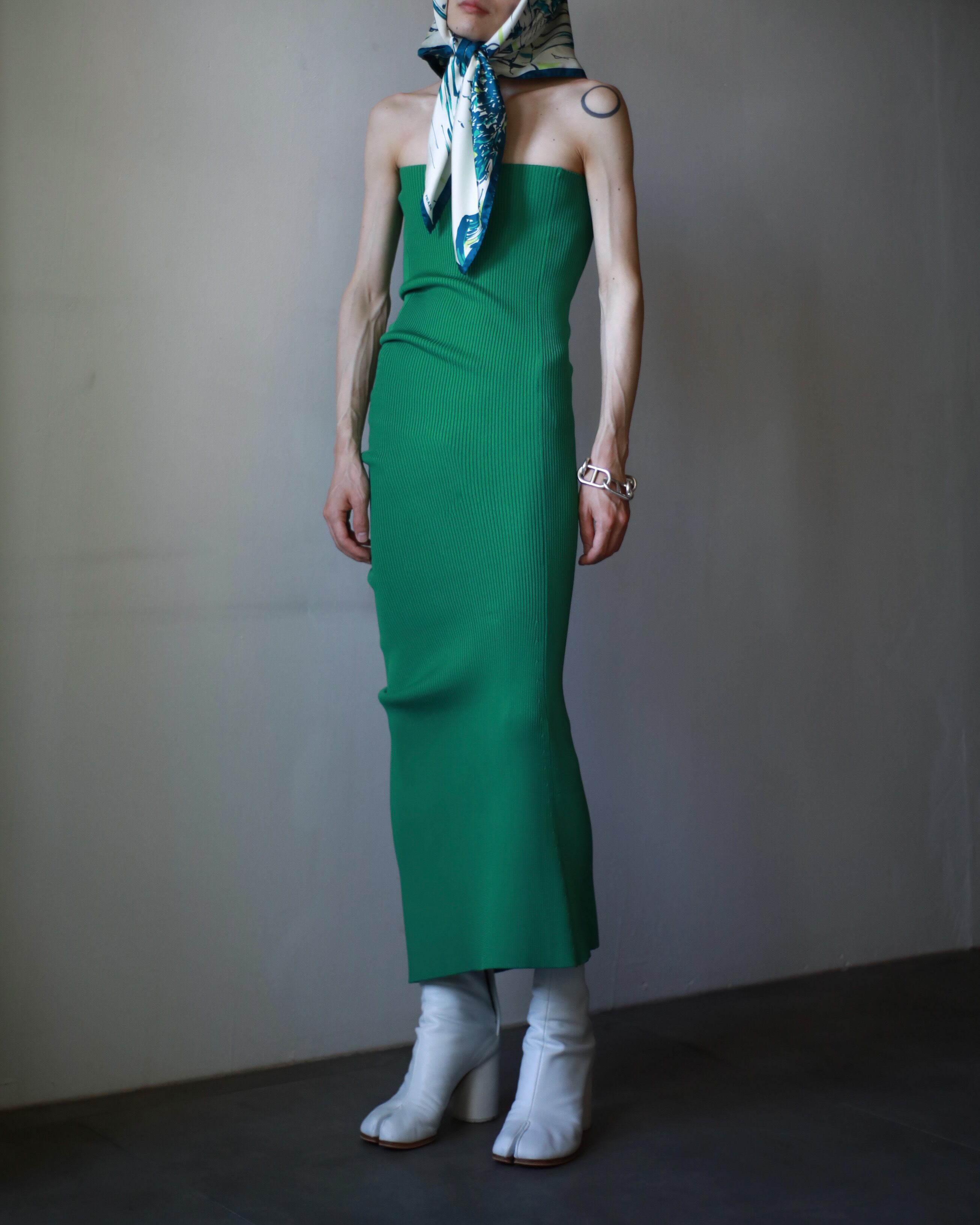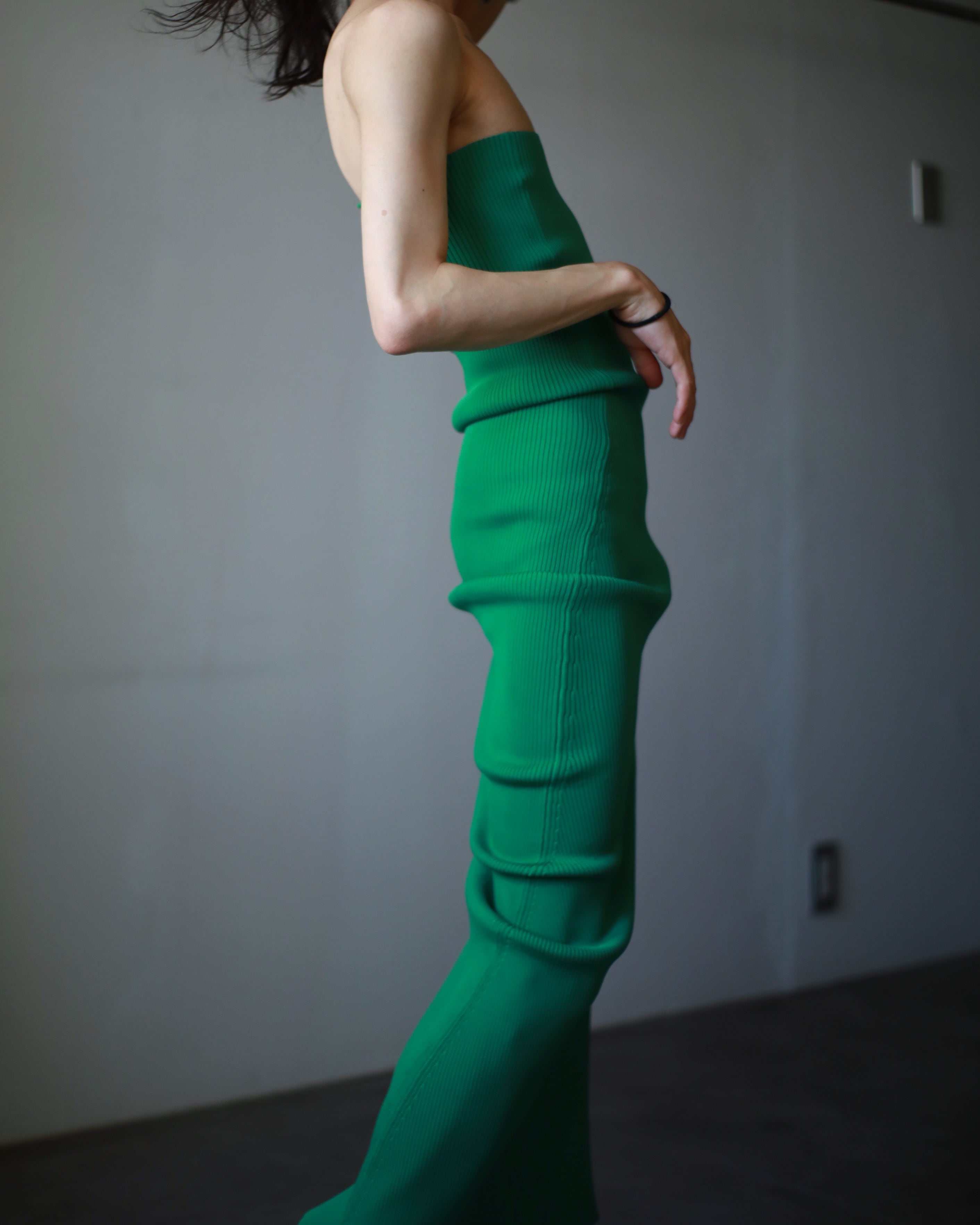 サマーニットのリブ生地でこのファブリックだからこそ、この形で服として成立してくれてるんだなあと思えるくらい計算されたファブリックとデザイン。