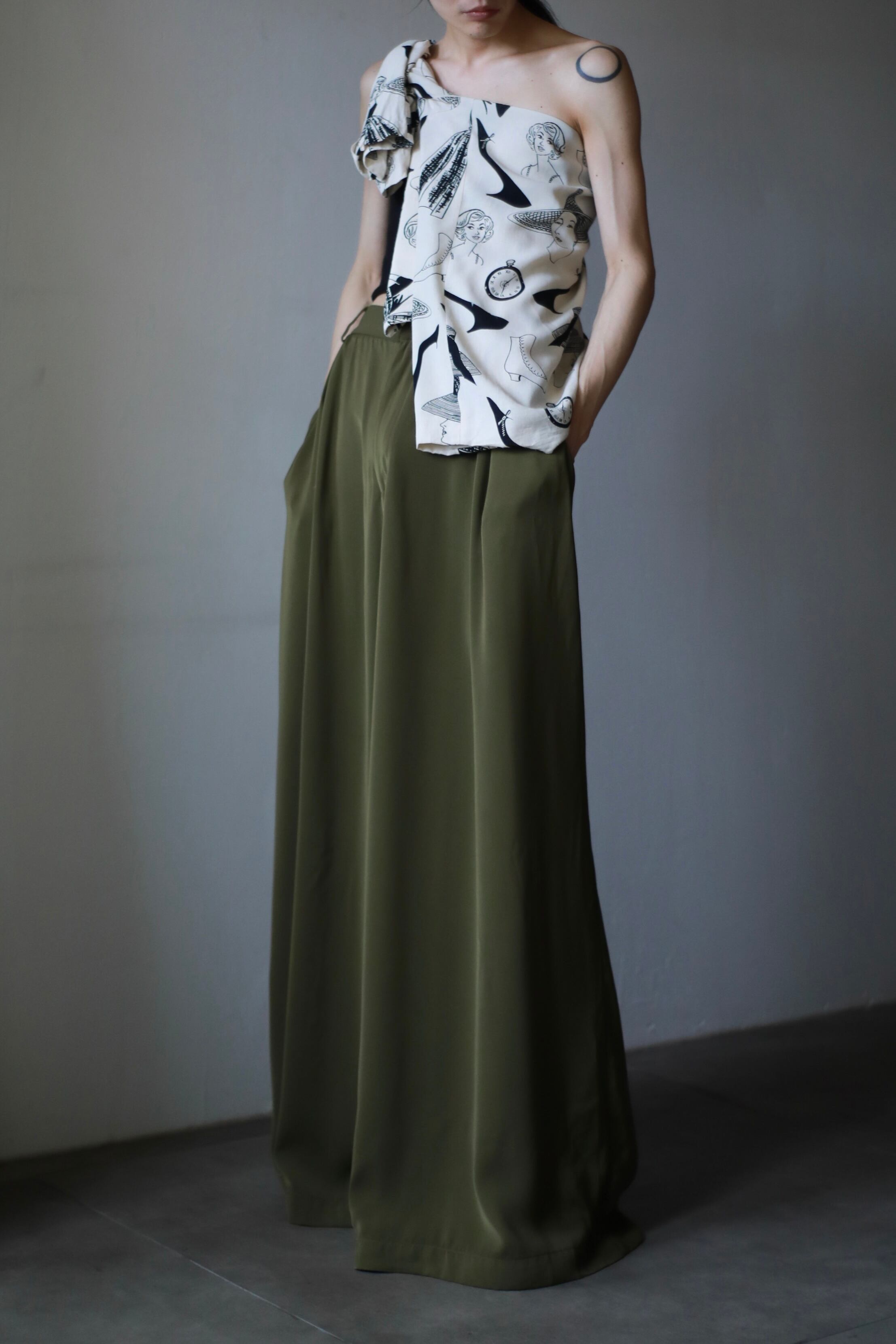 普通の大きなパンツではこうは絶対ならないのですが、此方シルエットや生地感が完璧で、絞って履いて綺麗目やモードなスタイリングにバシッとハマるデザインになっております。