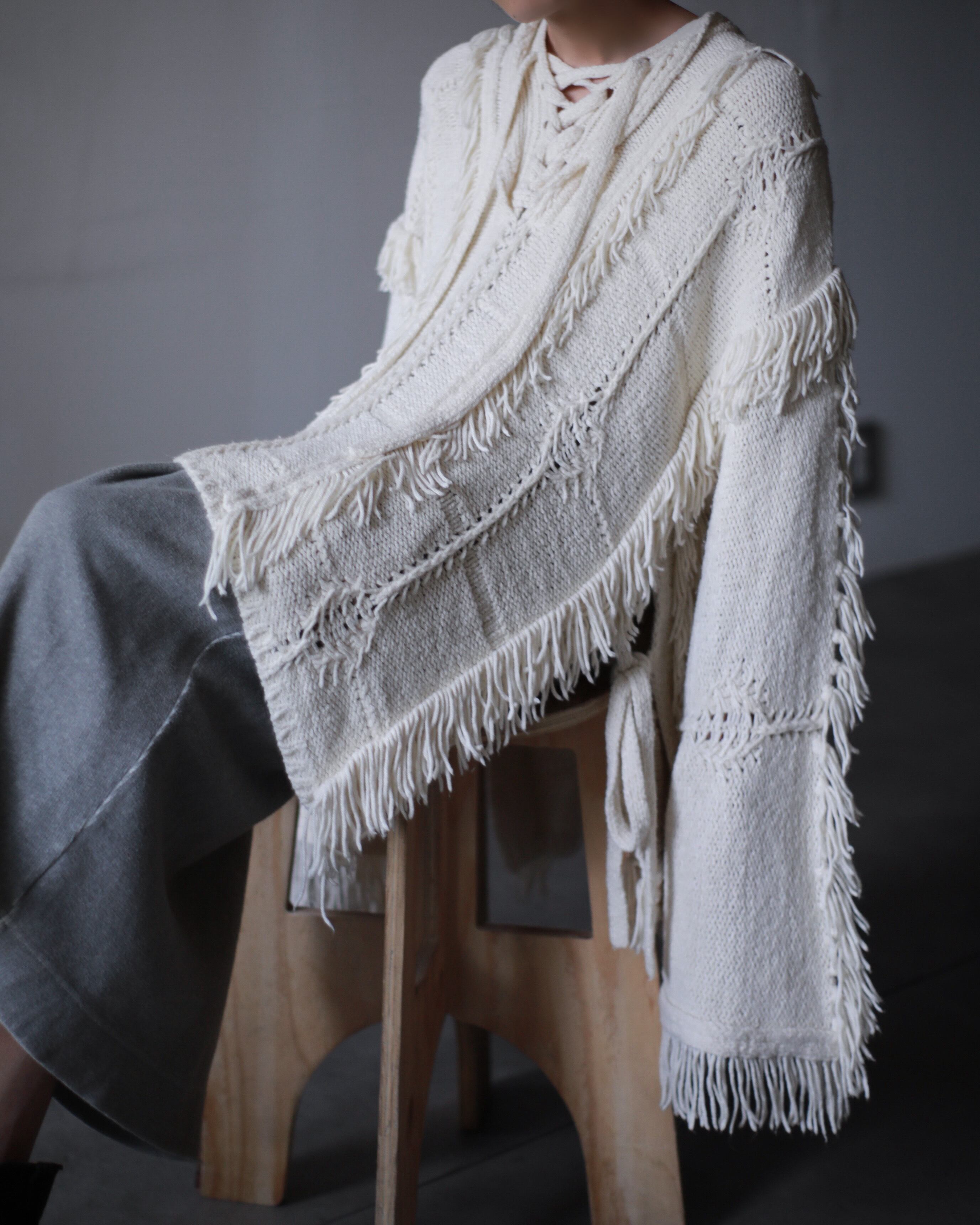 かなりざっくりとした編み感なので暖かすぎる感じもなく20°くらいだったら一枚でちょうど良く着れると思います。