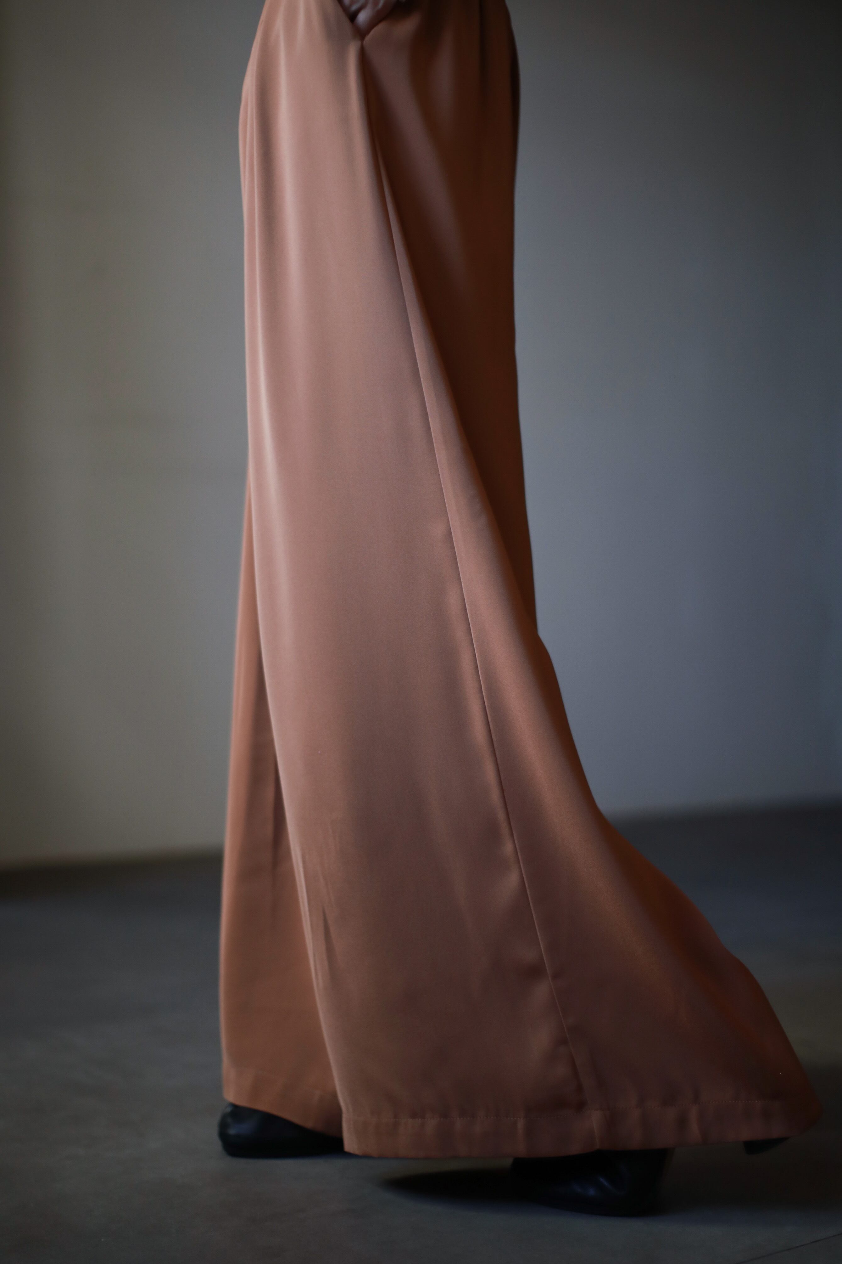 ドレープファブリックでスーパーワイドシルエットを綺麗目な印象に落とし込んでくれています。