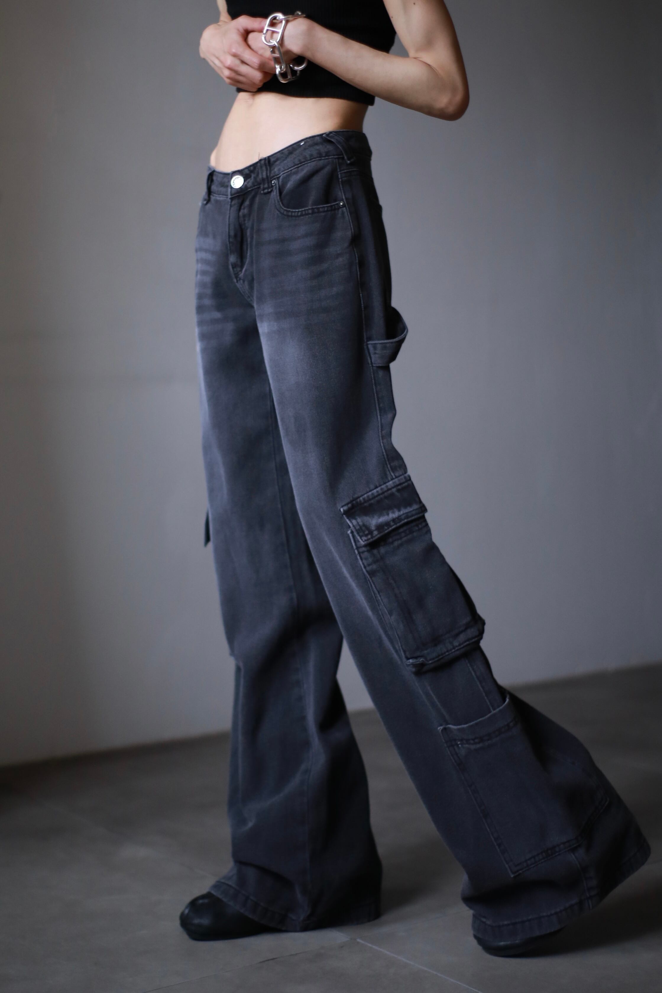 裾にボリュームのあるワイドバギーフレアシルエットで履くだけでスタイルも良く見える形です。