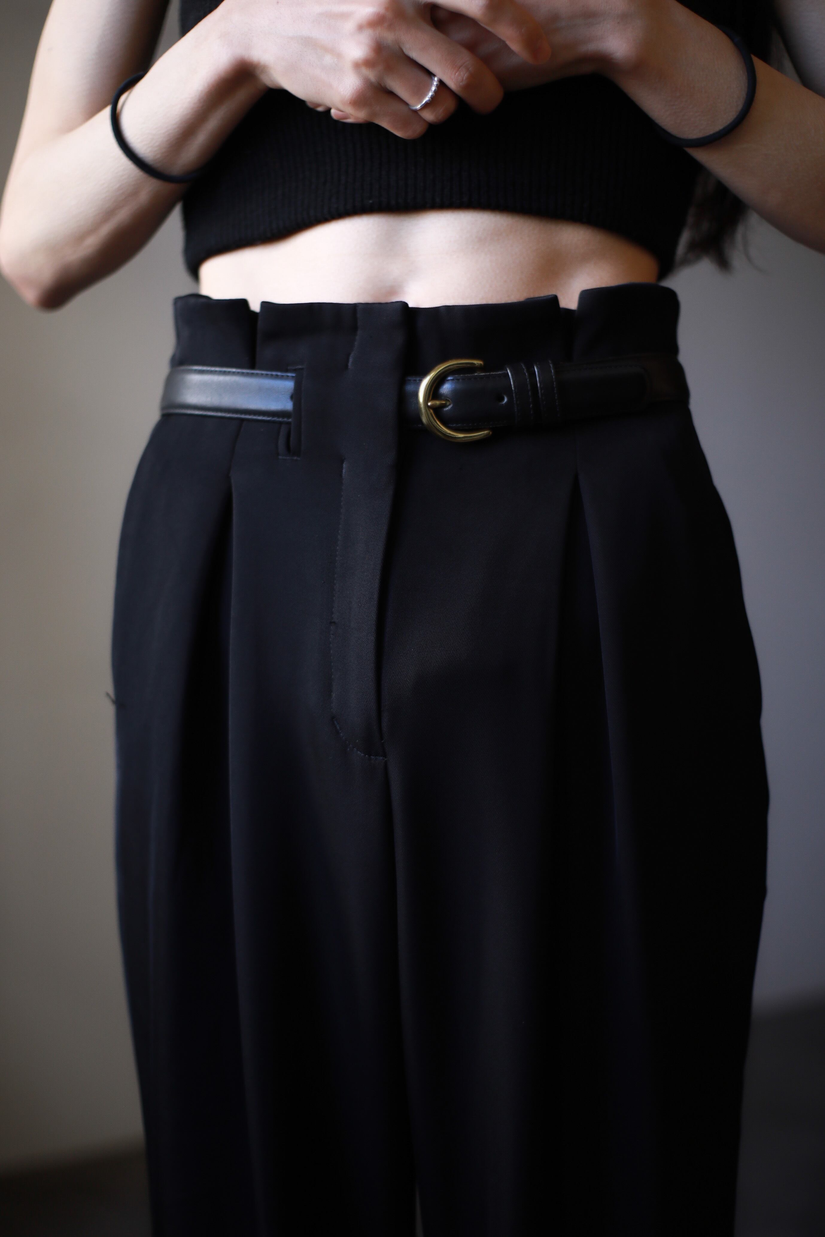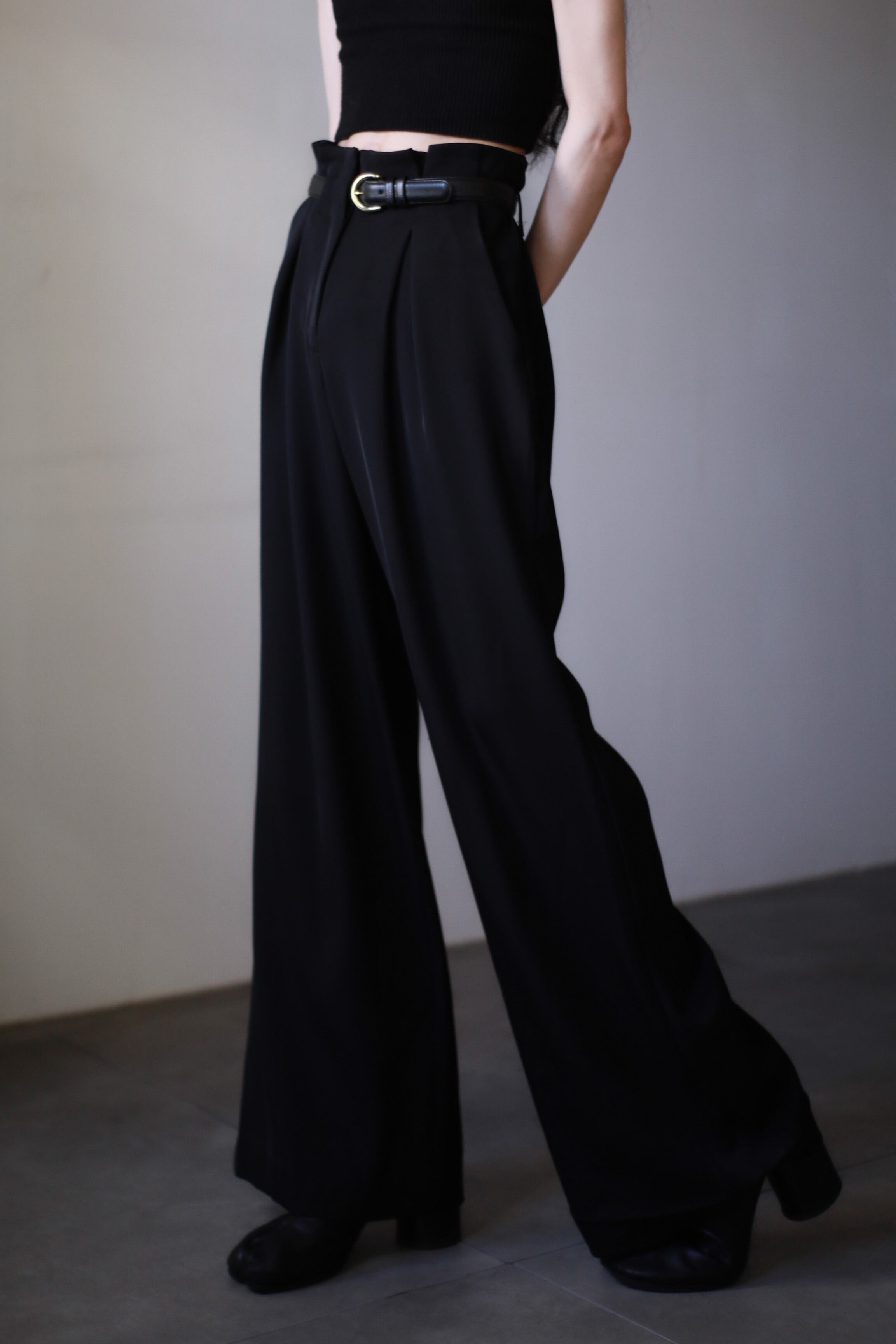 off center belt loop design hi-waist 2 tuck design wide straight slacks toromi fabric