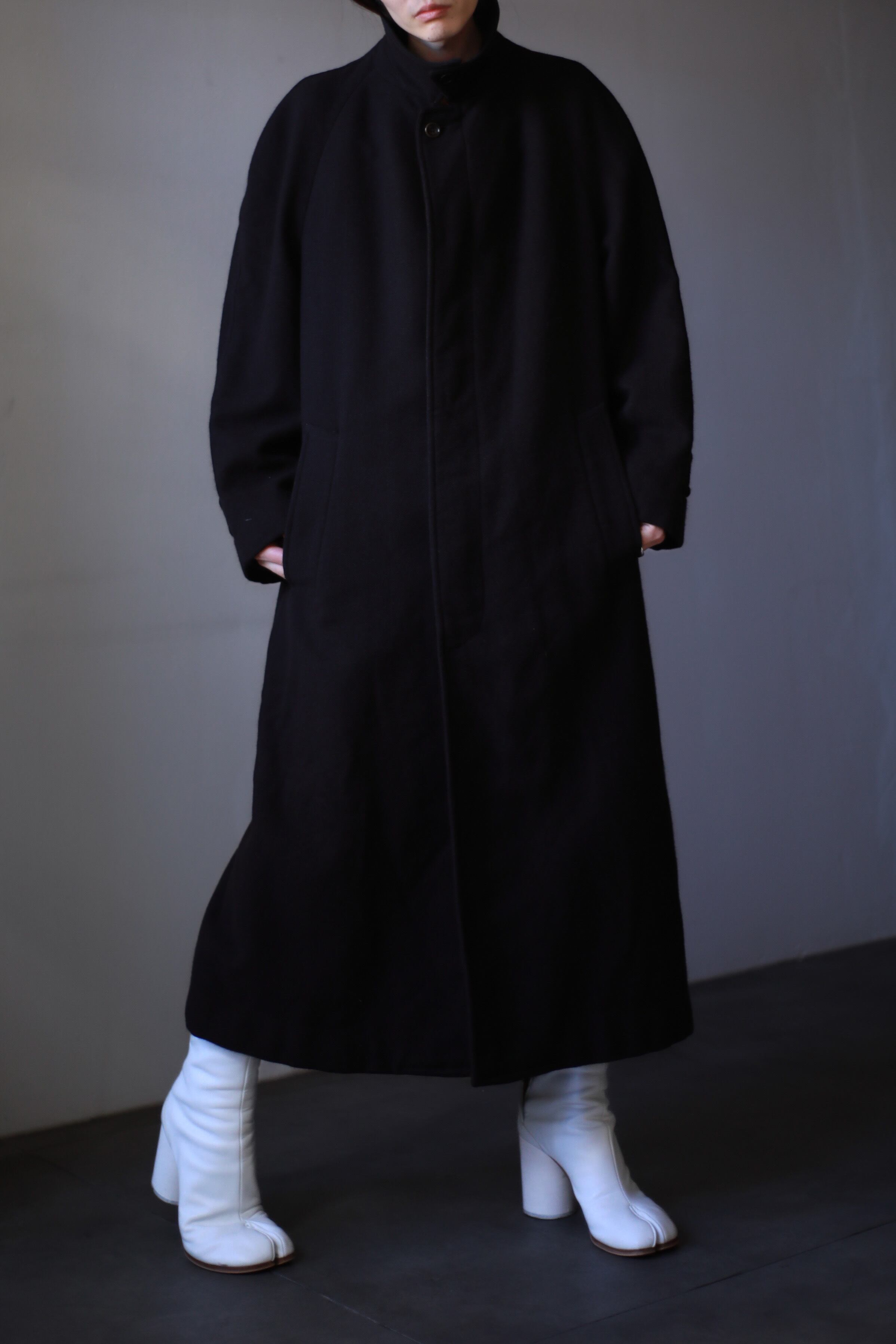 ウールコートって肩の張る四角いチェスターコートなんかが一般的だと思いますが、こちらは肩の落ちる丸いラグランスリーブでとっても着やすいなあと思います。