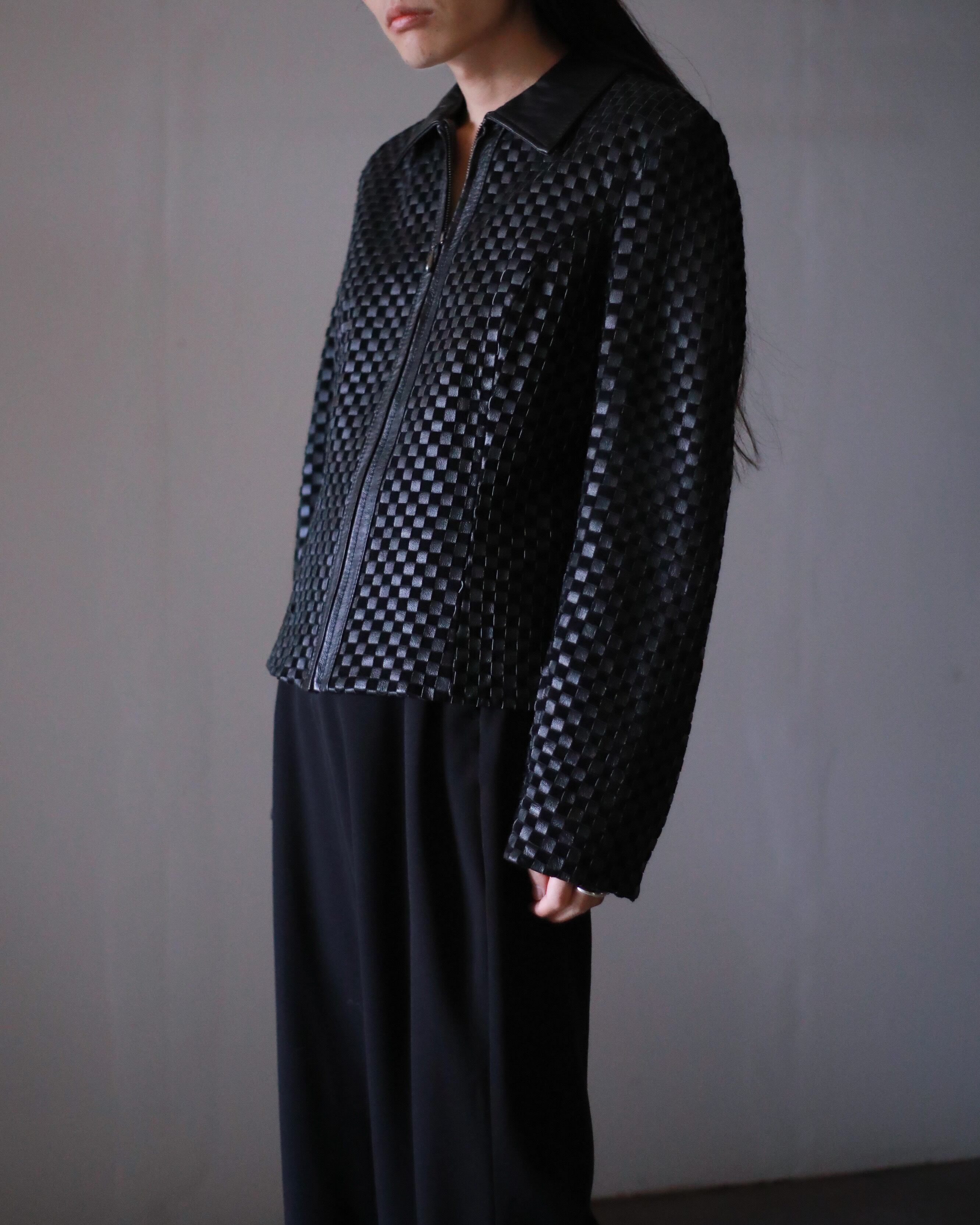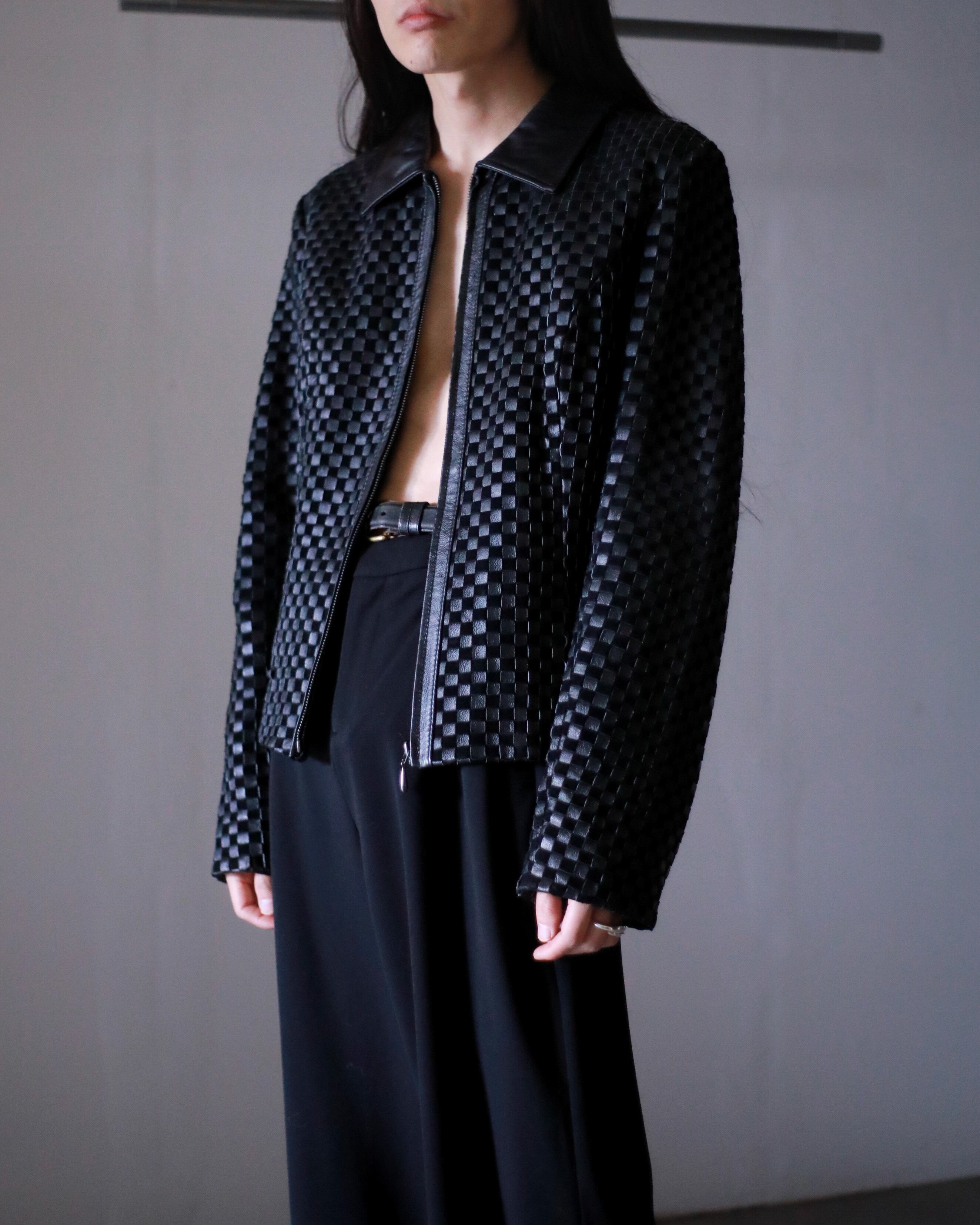 ボッテガのような編み込みデザインが魅力的なレザージャケット。
