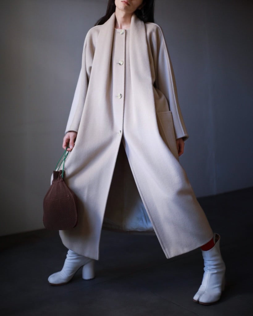 1980s Max Mara "PIACENZA" wool kimono sleeve no collar stole docking design long coat made in Italy