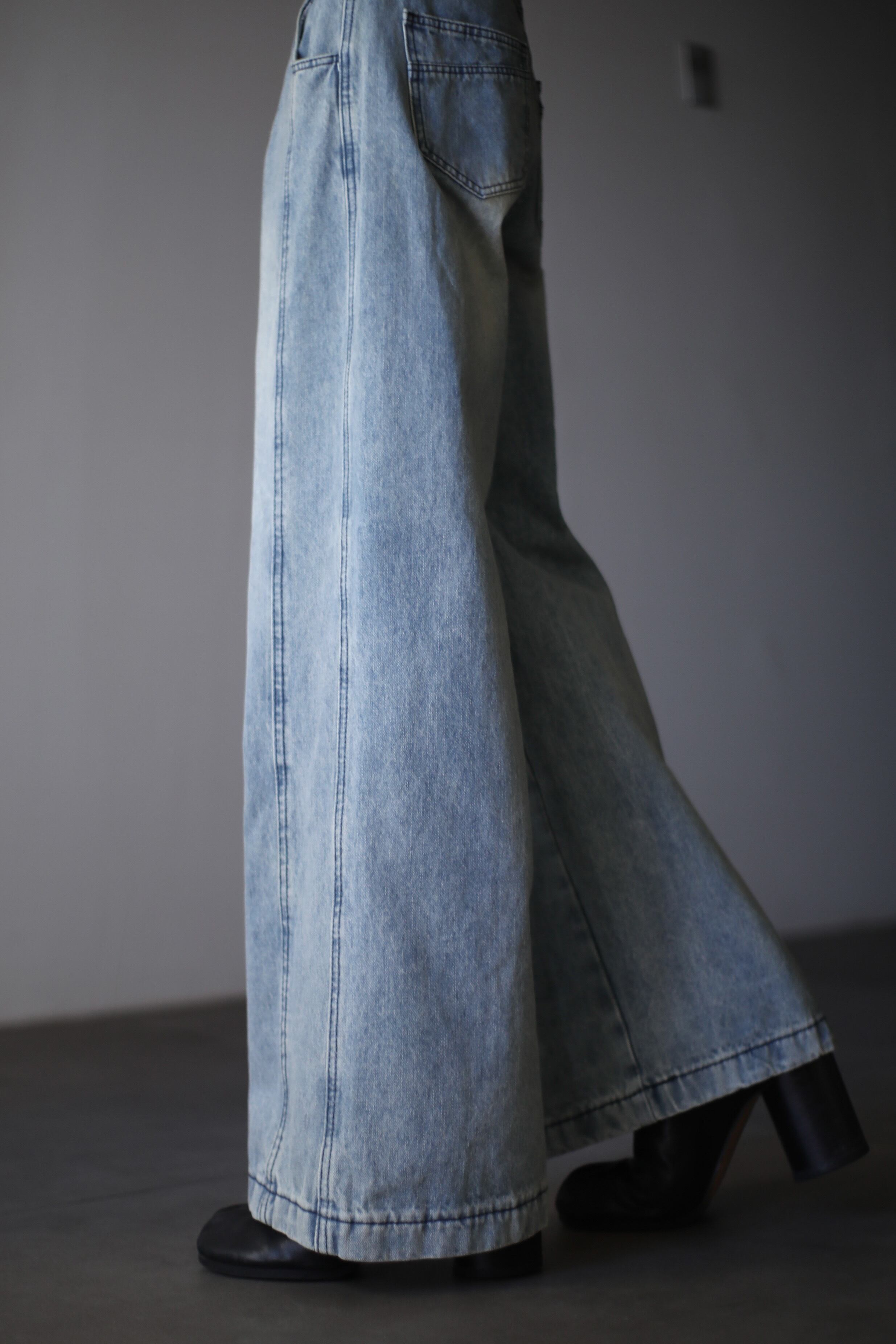 ドカンとした裾にボリュームのあるワイドストレートシルエットが最高なデニムパンツ。