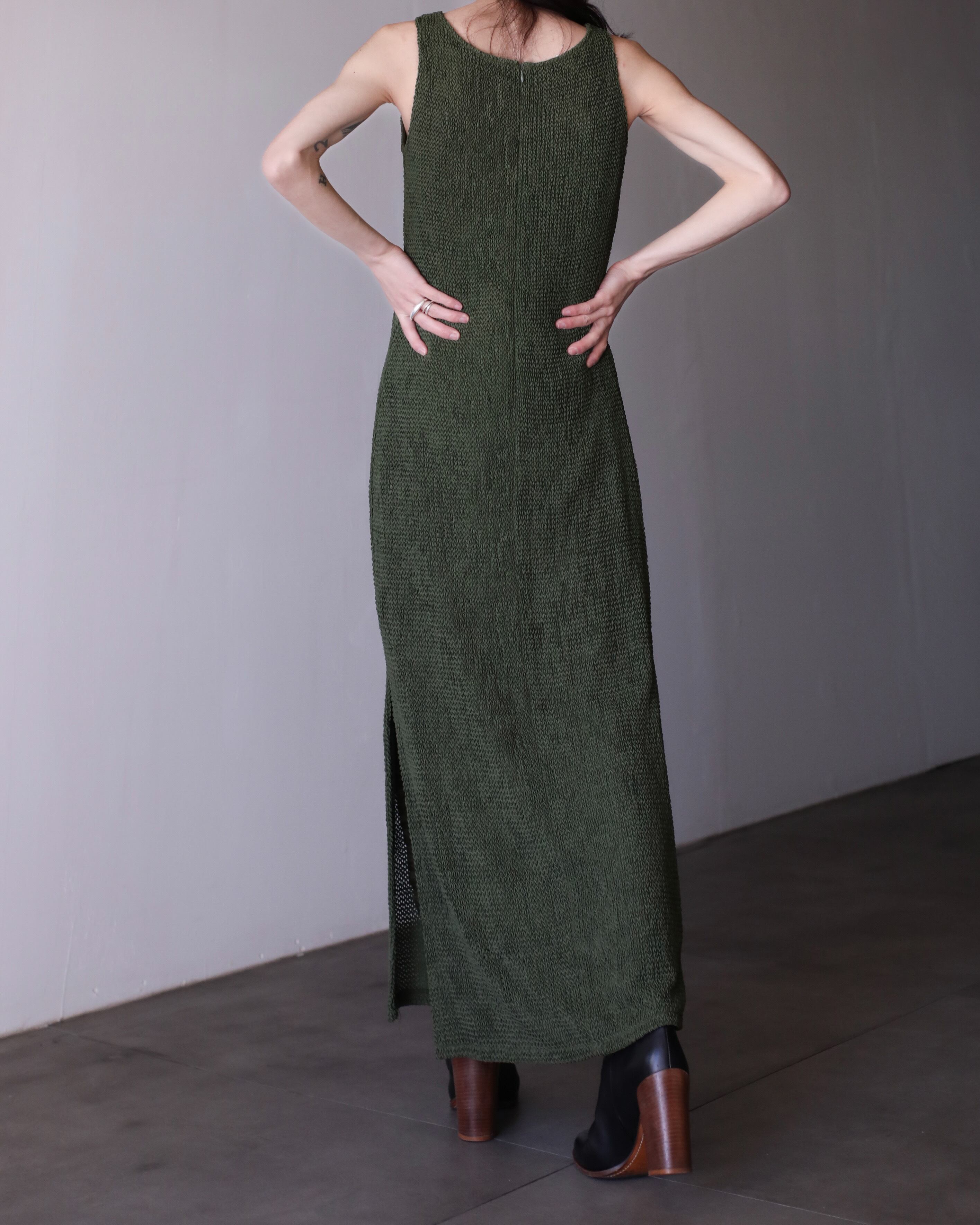 1980s "amikomi" knitting green tea color maxi dress one piece Made In USA